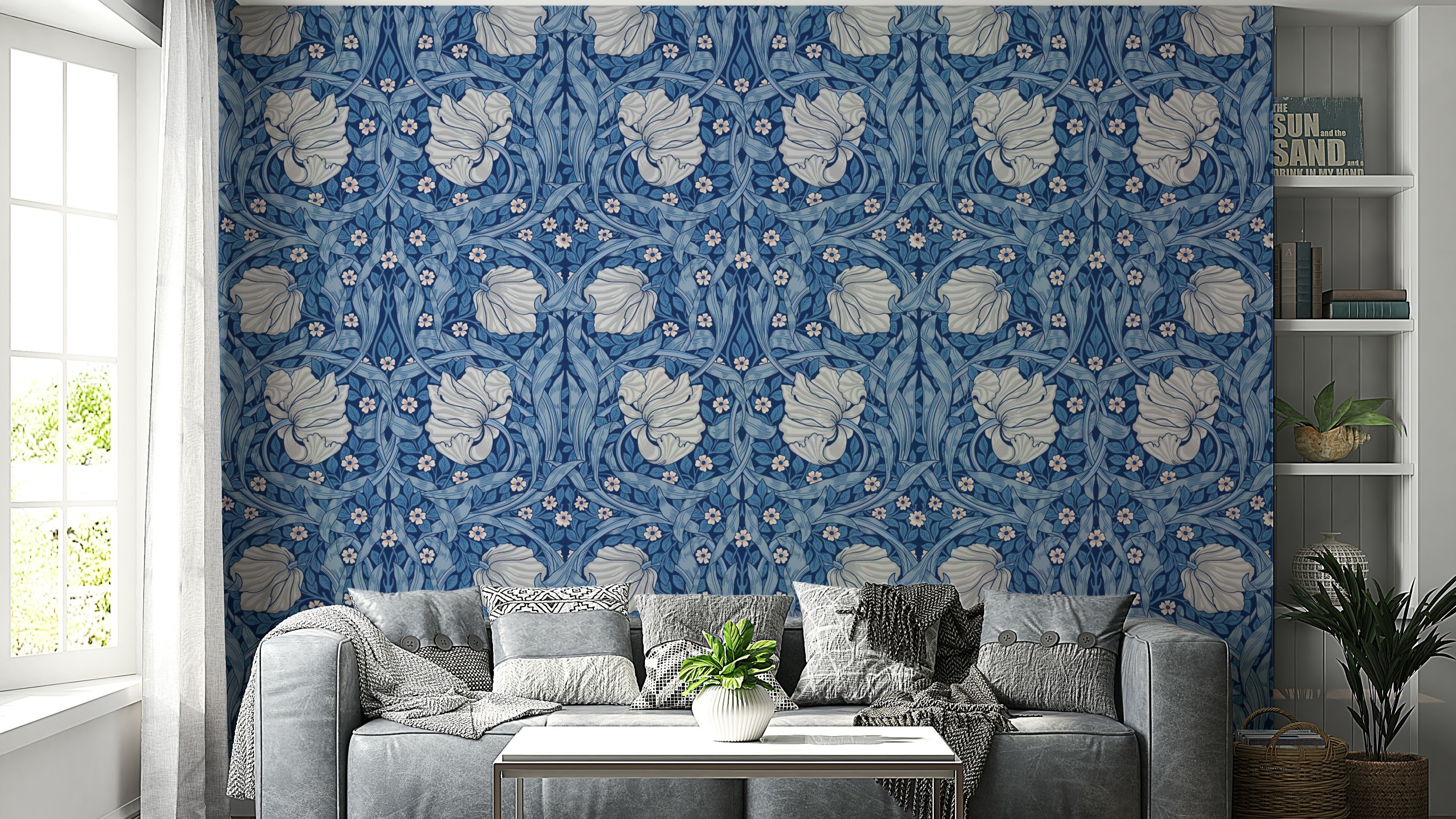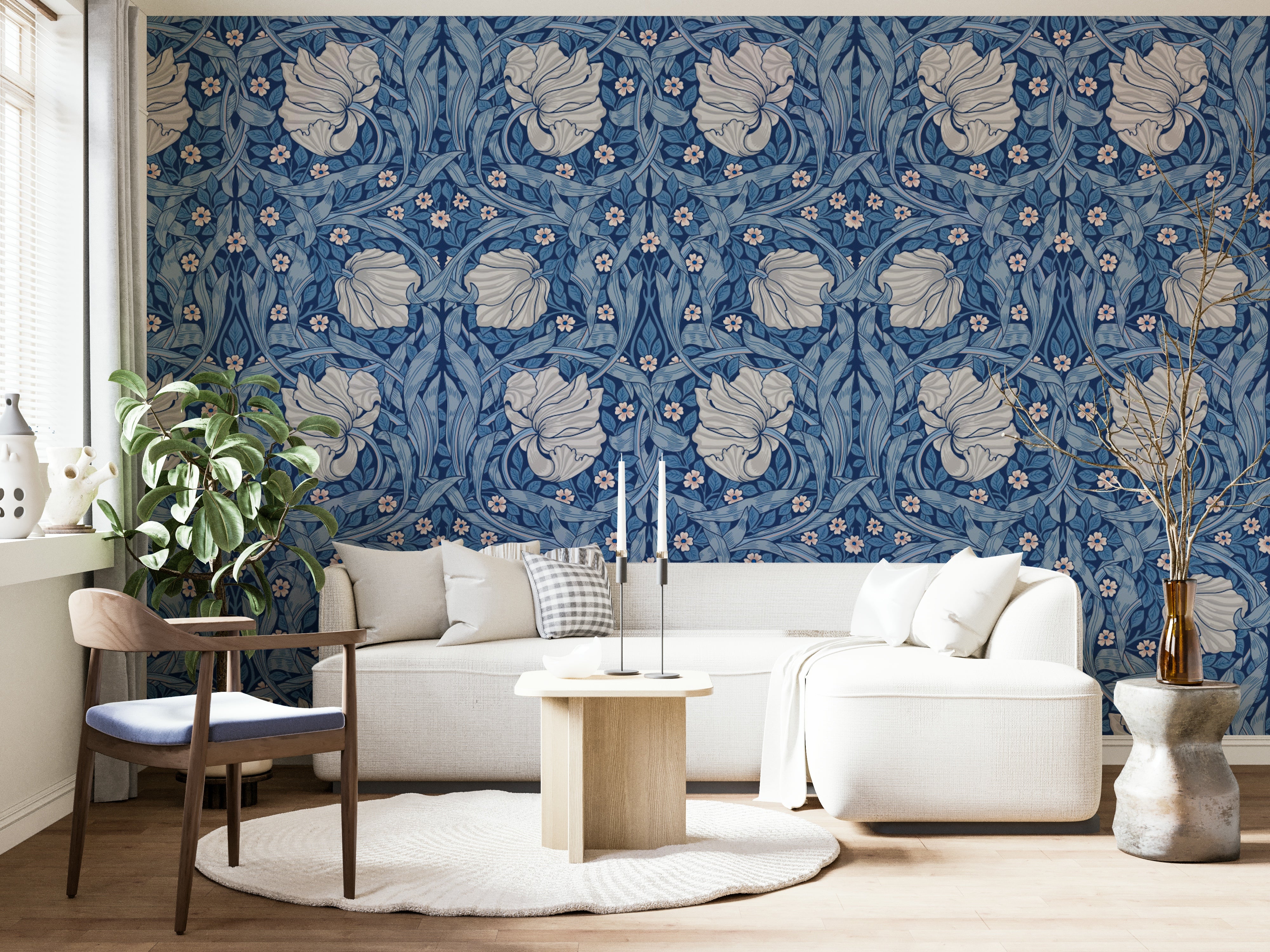 Indulge in the timeless elegance of "Pimpernel by William Morris 22." This captivating wallpaper showcases a richly detailed Art Nouveau design, featuring stylized pimpernel blossoms nestled amongst flowing, intricately drawn leaves in a serene palette of blues and soft greys. The repeating pattern creates a sense of calm and sophistication, perfect for adding a touch of classic beauty to any space. The elegant lines and graceful curves of the botanical motifs evoke a sense of peace and tranquility, making this wallpaper a stunning choice for bedrooms, living rooms, or any area where a touch of artistic sophistication is desired. Experience the artistry of William Morris reimagined for the modern age.