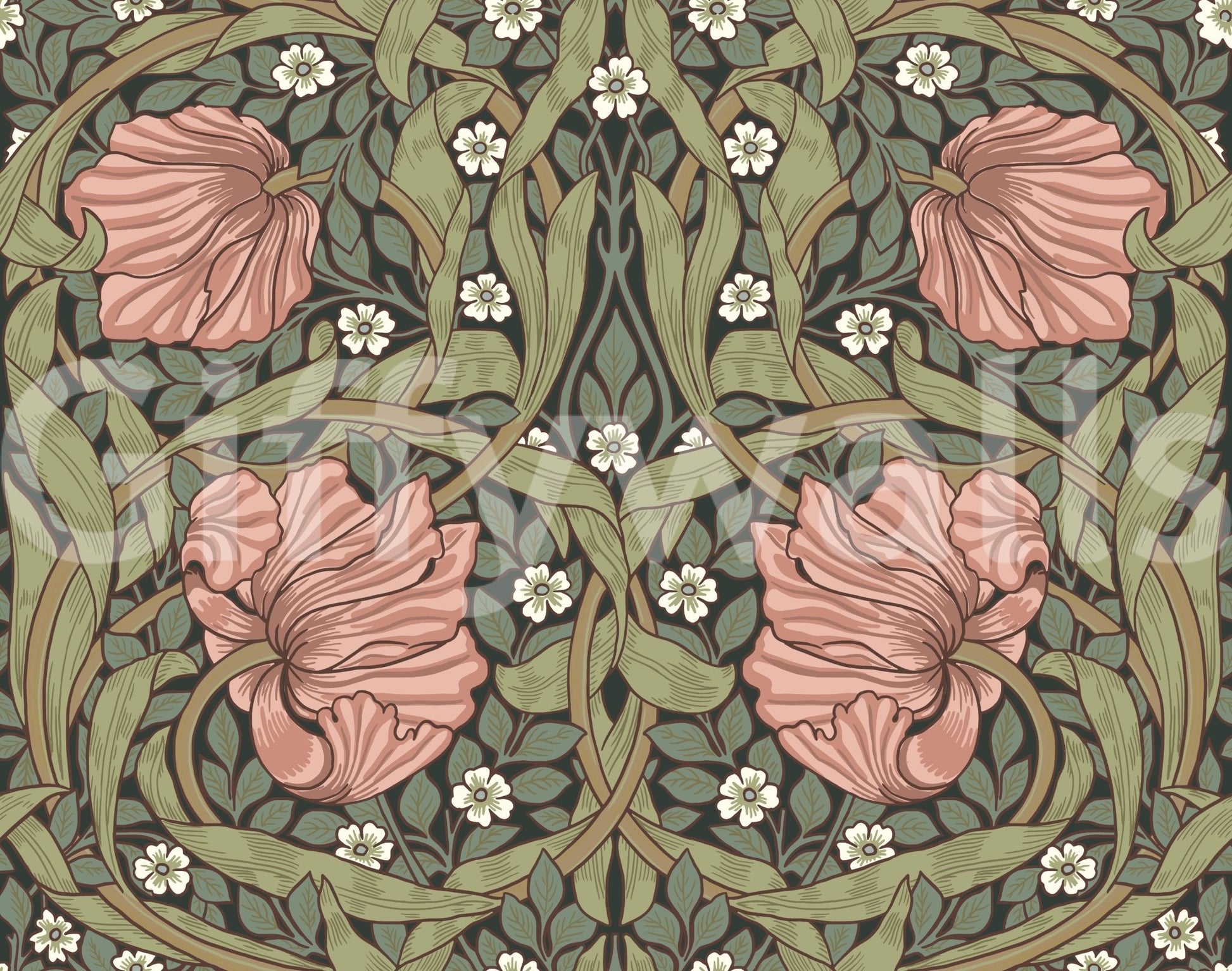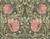 Indulge in the timeless elegance of "Pimpernel by William Morris 26." This captivating wallpaper showcases a mesmerizing tapestry of blush-pink pimpernel blossoms intertwined with lush, stylized foliage in muted greens and browns. The intricate, Art Nouveau-inspired design features a symmetrical arrangement, creating a sense of balanced harmony. Delicate white flowers punctuate the scene, adding a touch of ethereal beauty to the rich, dark background. This wallpaper evokes a sense of serene sophistication, perfect for adding a touch of classic beauty to any space. The detailed linework and elegant color palette make it a versatile choice for both traditional and modern interiors.