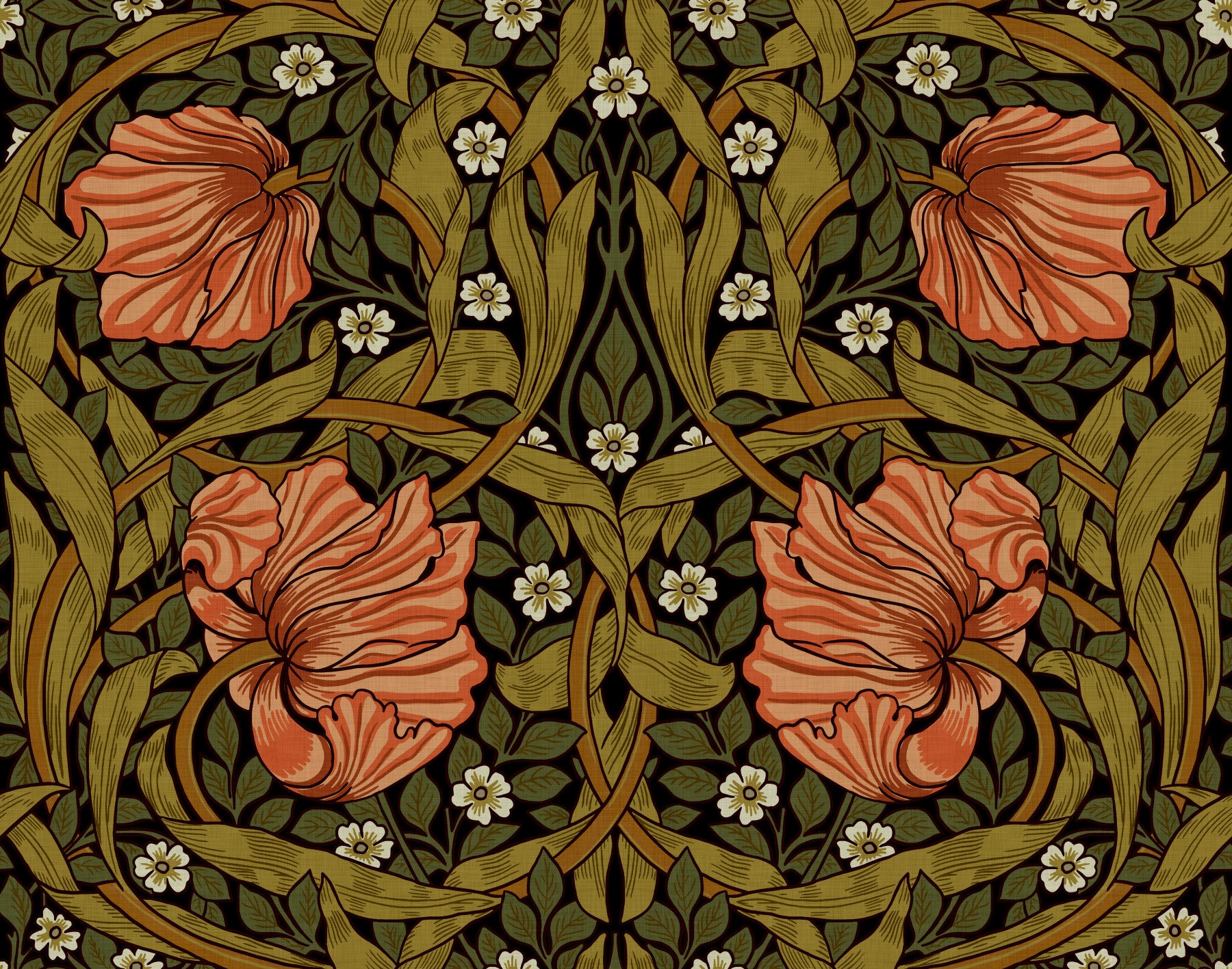 Intricate floral print Pimpernel wallpaper by William Morris.