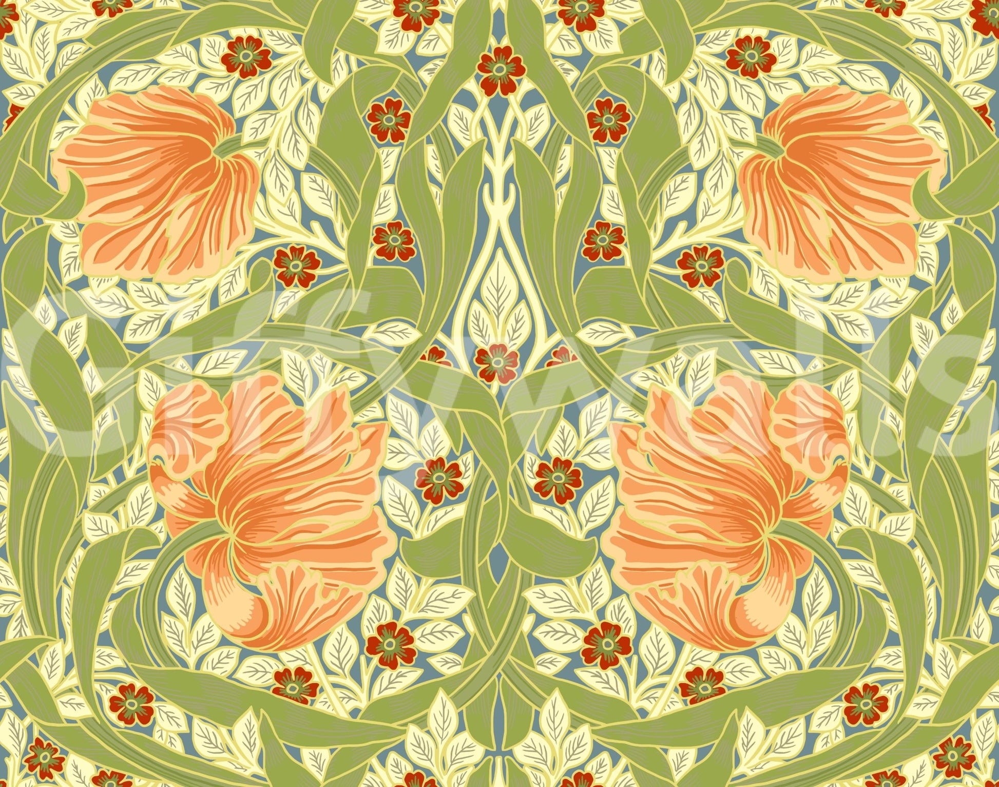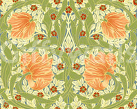 Immerse yourself in the timeless elegance of "Pimpernel by William Morris 8." This wallpaper showcases a breathtaking tapestry of stylized peach-toned blossoms, meticulously interwoven with verdant leaves and delicate crimson flowers against a muted blue-green backdrop. The design's intricate detailing and symmetrical composition evoke the rich artistry of the Arts and Crafts movement, creating a harmonious and sophisticated atmosphere. Perfect for adding a touch of classic beauty to any space, this wallpaper beautifully captures the spirit of William Morris's iconic floral designs, offering a refined and calming ambiance.