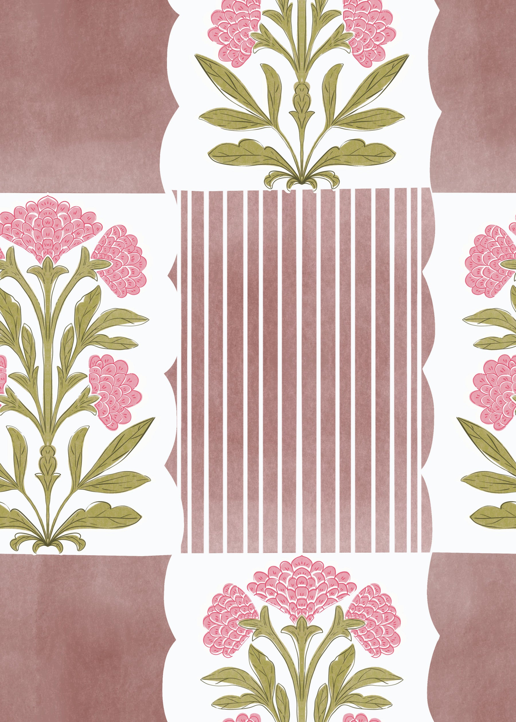 Enhance interiors with this charming floral and striped wallpaper. A delightful combination of pink flower illustrations with olive foliage is highlighted against textured, striped sections. This wallpaper for walls enlivens dining rooms, bedrooms, or entryways. The design pairs well with classic or modern furnishings, adding a peaceful, warm touch. It's a simple way to introduce sophistication and organic allure to any room, creating inviting spaces.