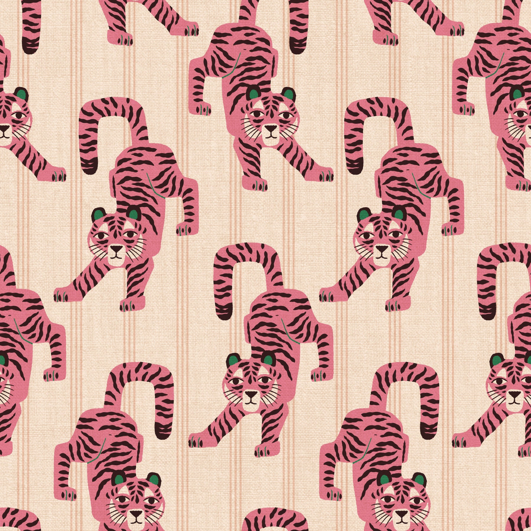 Embrace playful sophistication with this "Pink Jumping Tiger Jewel Jungle" wallpaper. A whimsical design features a repeating pattern of stylized pink tigers, their dark stripes contrasting beautifully against their vibrant hue. Each tiger is playfully depicted in a mid-leap, creating a dynamic and energetic feel. The subtle, pale pink and cream striped background adds a touch of elegance, reminiscent of a luxurious textile. This wallpaper effortlessly blends bold animal print with a sophisticated color palette, perfect for adding a touch of unexpected fun and personality to any space. The design is both modern and timeless, making it a versatile choice for various interior styles.