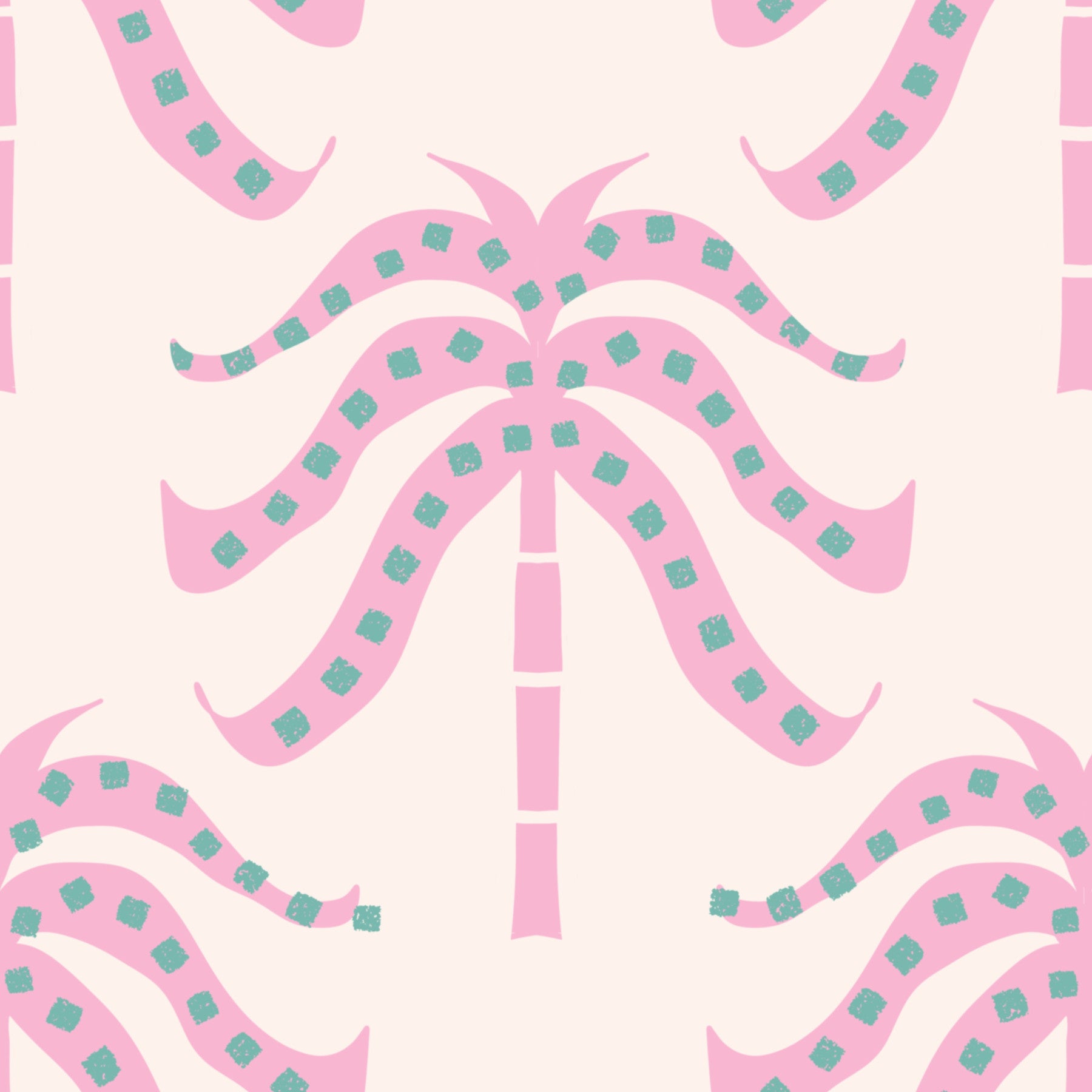 Drift away to a tranquil paradise with 'Pink Palms Soft Pink'. This wallpaper evokes a sense of serene relaxation through its gentle color palette and playful palm tree motif. Soft pink silhouettes of stylized palm trees, adorned with subtle teal textured squares, create a visually soothing and inviting atmosphere. The creamy off-white backdrop enhances the softness, making it perfect for creating a calming oasis in any space. Ideal for bedrooms, nurseries, or any area where you desire a touch of whimsical tranquility, 'Pink Palms Soft Pink' offers a refreshing escape with its delicate aesthetic and charming design. Bring the whisper of a tropical breeze into your home with this delightful and subtly textured wallpaper.