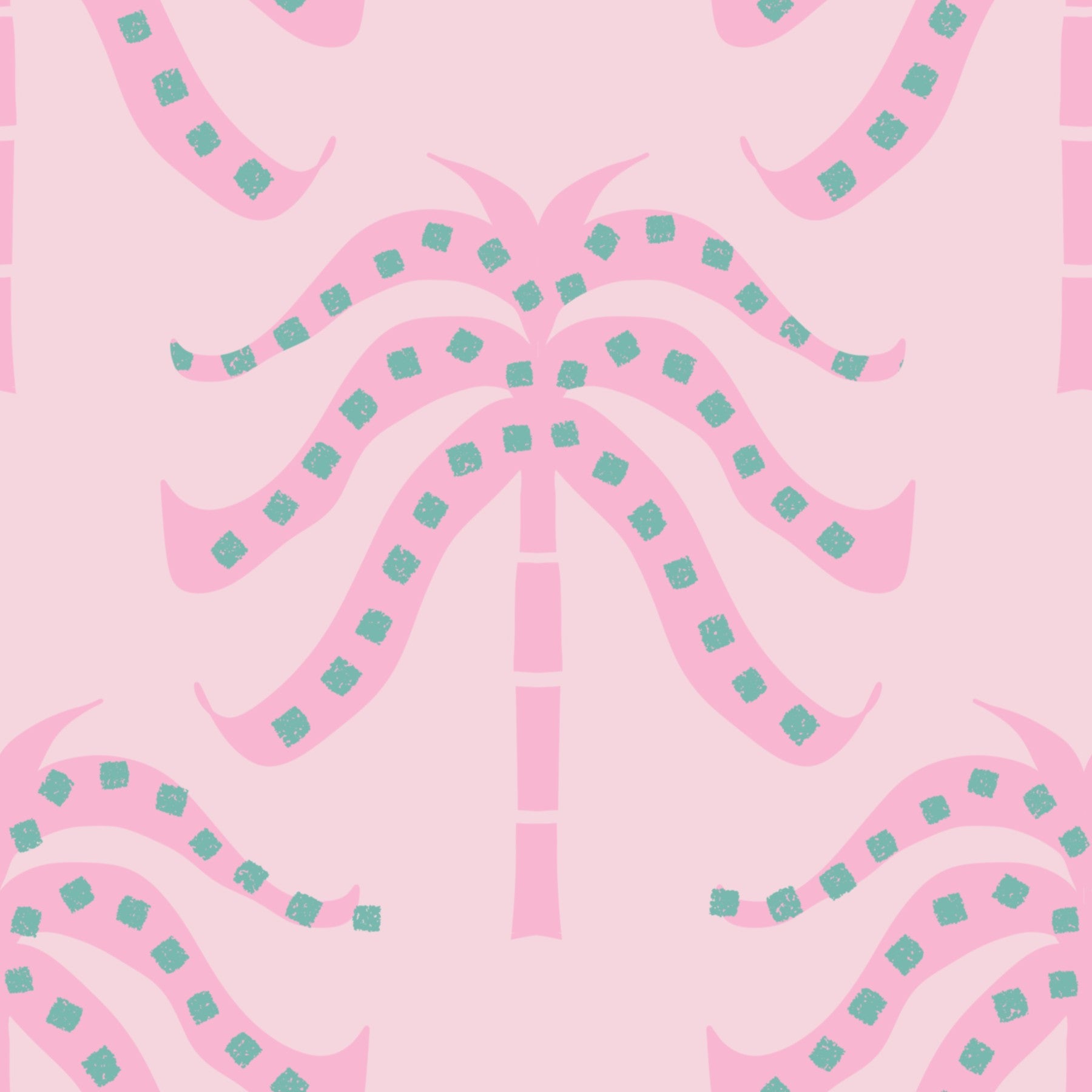 Create a serene oasis with this delightful palm tree print. Light pink meets turquoise creating a calming visual. This wallpaper for walls is a wonderful way to give a bathroom, nursery, or bedroom a cheerful yet restful ambiance. This unique design complements interiors by adding a splash of color without overwhelming your space. Soft, dreamy, and undeniably charming, this wallpaper offers style.