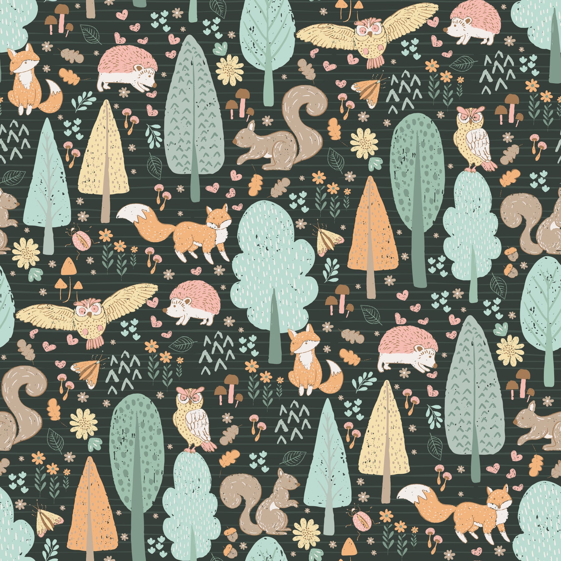 Playful Woodland Nursery Animals Dark Green Background Wallpaper features charming illustrations of foxes, squirrels, owls, and hedgehogs set among colorful trees and foliage. This mural wallpaper is perfect wallpaper for walls in nurseries, playrooms, or children’s bedrooms where a fun and cozy atmosphere is desired. The rich dark green background contrasts beautifully with soft pastel colors, adding depth and warmth to the space. Made from durable, easy-to-install materials, this wall mural offers lasting quality and simple upkeep. Its whimsical design encourages imagination and brings a joyful woodland spirit into your child’s room.