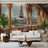 Transport yourself to Seville with this breathtaking wallpaper. Arches and columns frame the magnificent Plaza de España. The soft, warm palette creates a calm and inviting atmosphere. Perfect for enriching living rooms, hallways, or studies, this wallpaper for walls provides a sense of grandeur. Its architectural precision elevates interiors, lending sophistication to various spaces. Consider it for dining rooms or lounges. Bring timeless beauty into your home with this stunning vista.
