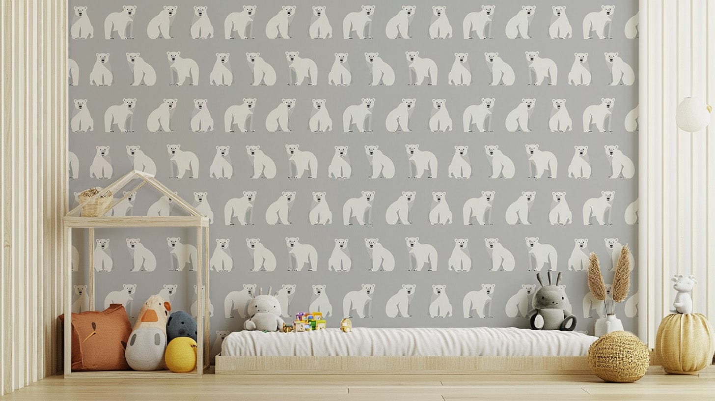 Give In to the Beauty Of Arctic with Polar Trio Arctic Bear Wallpaper. Warm Illustrator Polar bear in playful poses in a trio available on soft grey wallpaper which will bring coziness and whimsy to any kids room, nursery or even the chilliest aspects of your home it is featured. Such a perfect Scandinavian & nature lover design that will never go out of style. Enjoy some warm giants on your walls, even in the most cold seasons.