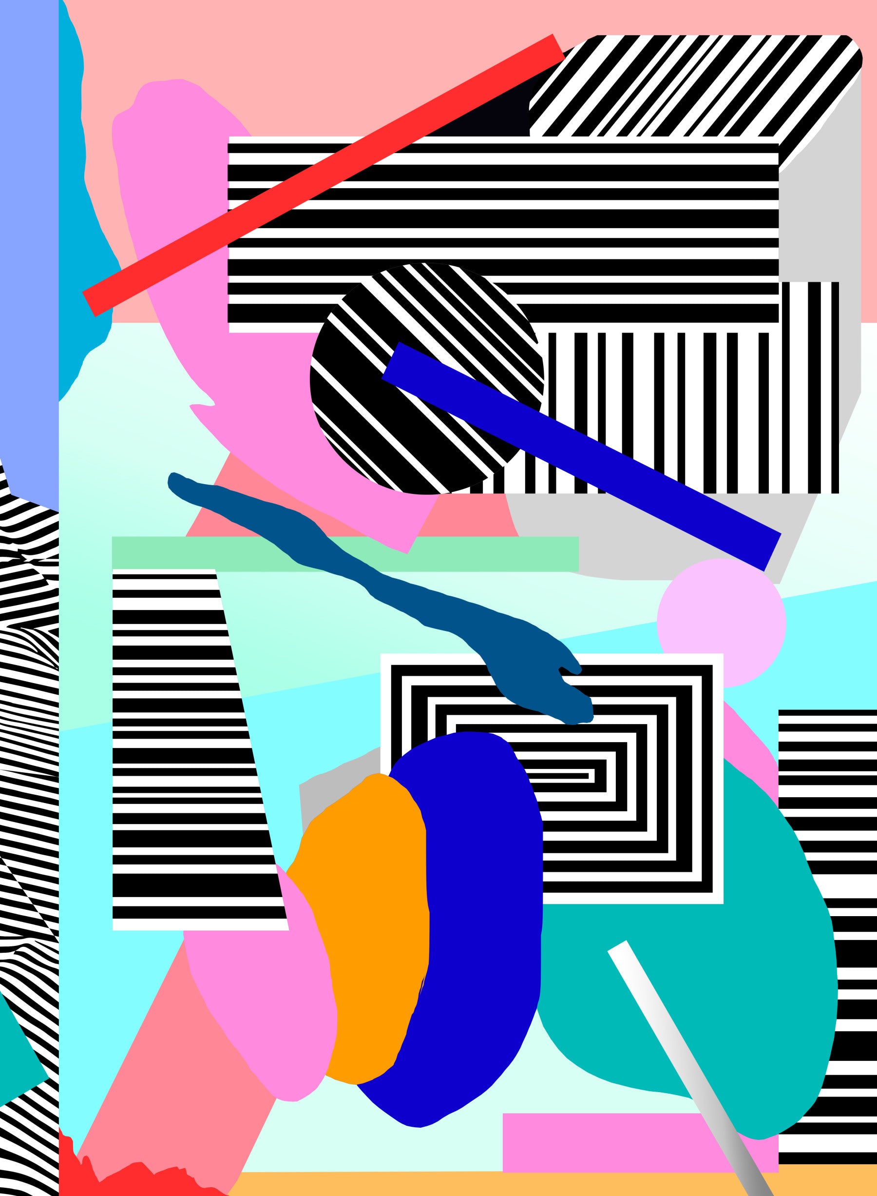 Bold shapes command attention in this lively geometric design. Stripes, circles, and rectangles create a dynamic composition in a palette of black, white, blue, pink and orange. The pattern energizes rooms, making it fantastic wallpaper for walls in modern living rooms, creative home offices, or a vibrant teen bedroom. Pair with minimalist furniture and pops of coordinating color to enhance the playful energy.