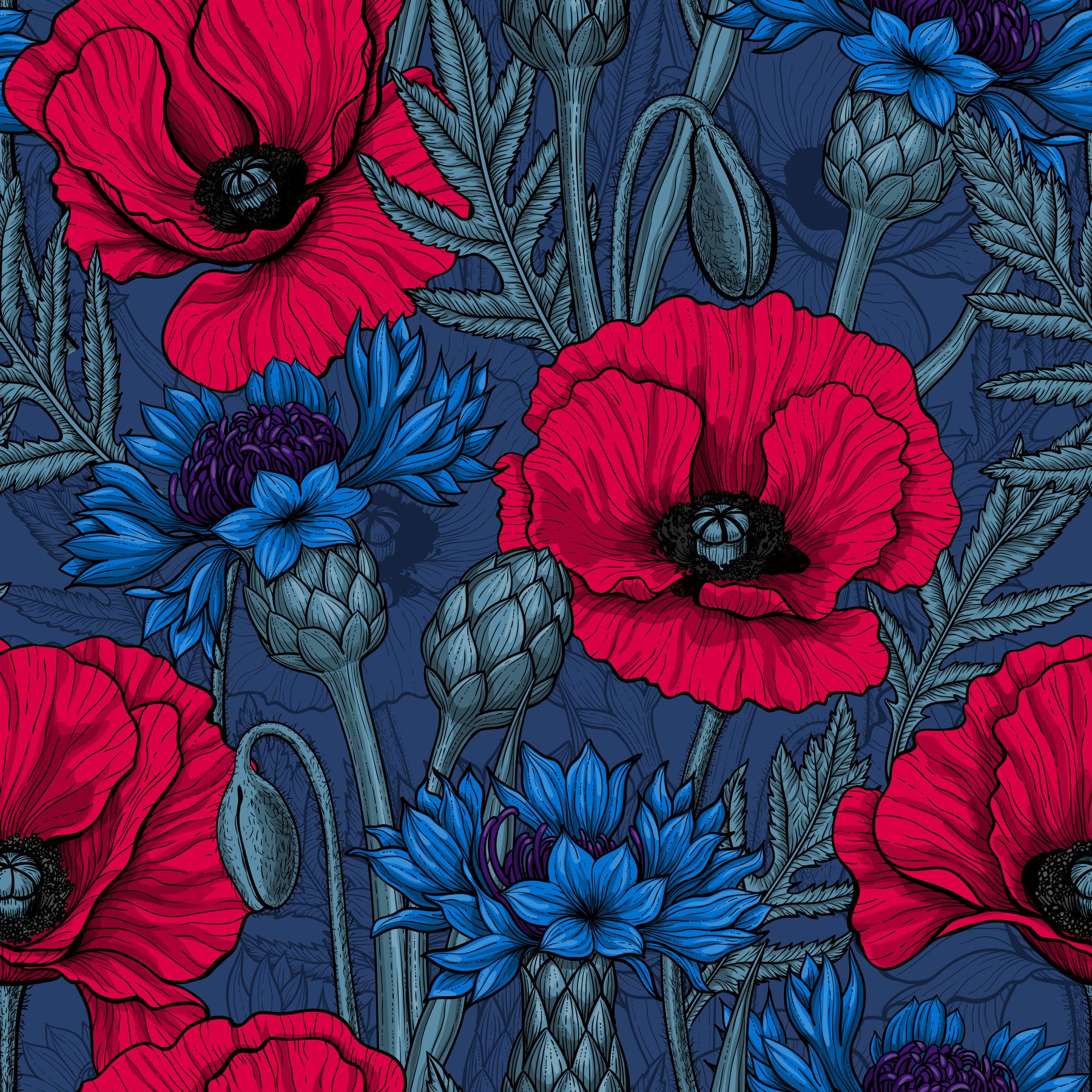 Step into a world of floral fantasy with this wallpaper, 'Midnight Garden: Poppies and Cornflowers.' The dark backdrop allows the vibrant red poppies and cool blue cornflowers to truly pop, creating a visually stunning contrast. The detailed linework provides depth and texture, while the artichoke buds add a unique, artistic element. Transform your space into a stylish sanctuary with this exquisite botanical design, perfect for creating a relaxing and sophisticated atmosphere.
