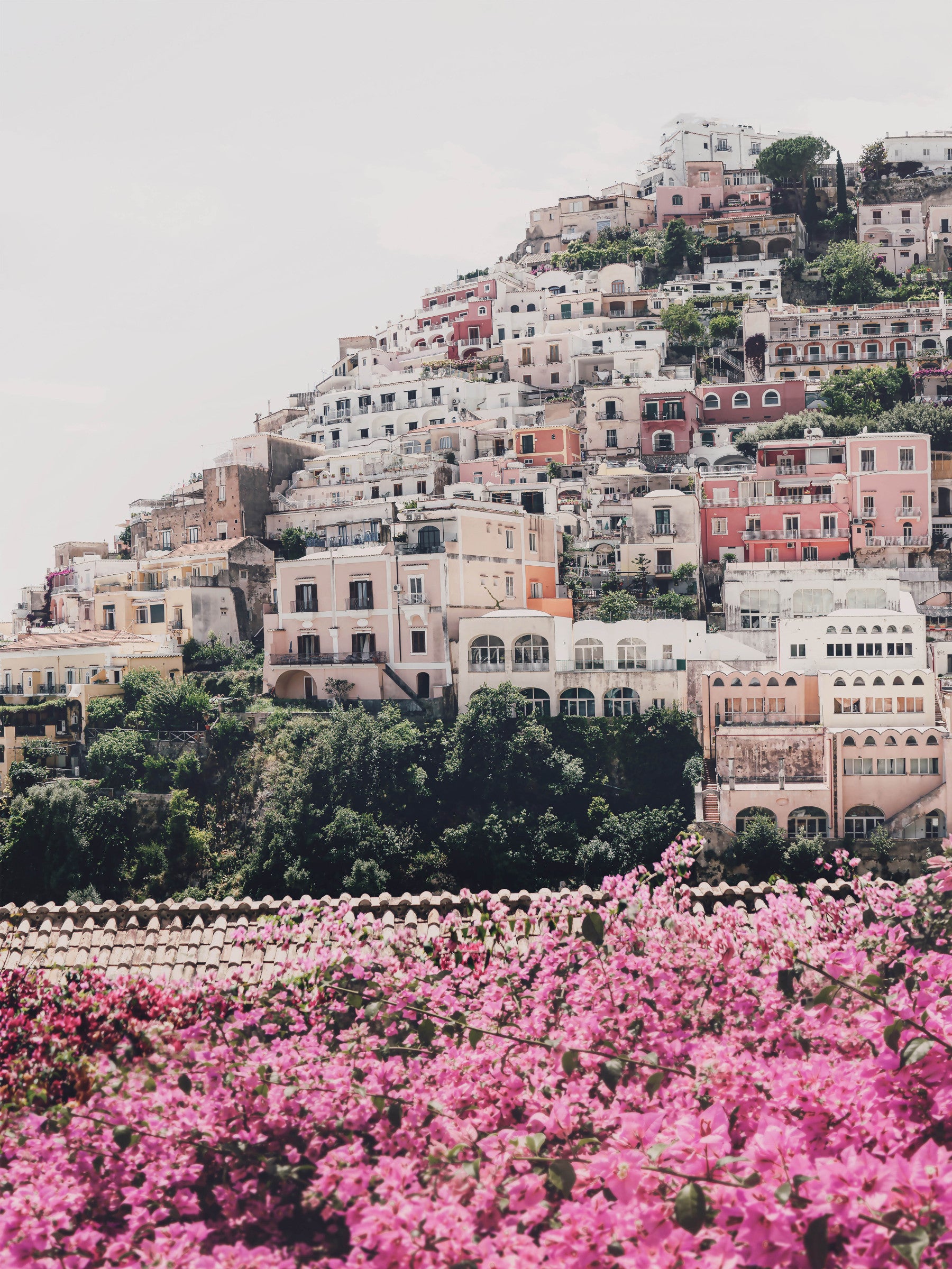 Capture the breathtaking charm of Positano with this stunning wallpaper. Pastel-hued buildings cascade down a hillside, a vibrant tapestry of architectural styles nestled amongst lush greenery. The scene is softened by a hazy sky, enhancing the dreamy, idyllic atmosphere. In the foreground, a profusion of bright pink bougainvillea blossoms adds a touch of vibrant color, creating a captivating contrast against the tranquil backdrop of the iconic Italian village. This wallpaper evokes a sense of serenity and escape, transporting you to the picturesque Amalfi Coast.