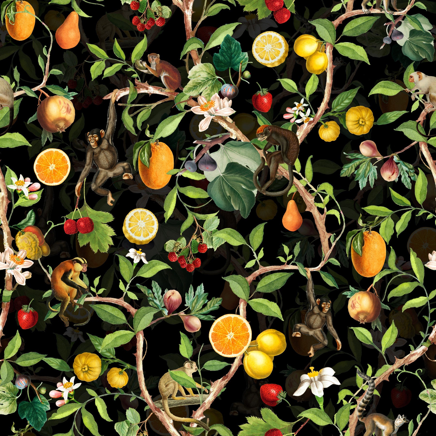 Bring the vibrancy of a tropical paradise into your home with 'Primate Paradise,' a stunning wallpaper design that perfectly captures the lively spirit of nature. This enchanting watercolor artwork features a variety of playful monkeys interacting amongst a bountiful display of exotic fruits—oranges, lemons, figs, and more—all rendered with exquisite detail. Set against a rich black backdrop, the bright colors of the fruits and the monkeys' playful expressions create a joyful and energetic atmosphere. This seamless pattern is perfect for adding a bold and cheerful touch to any room in your house.
