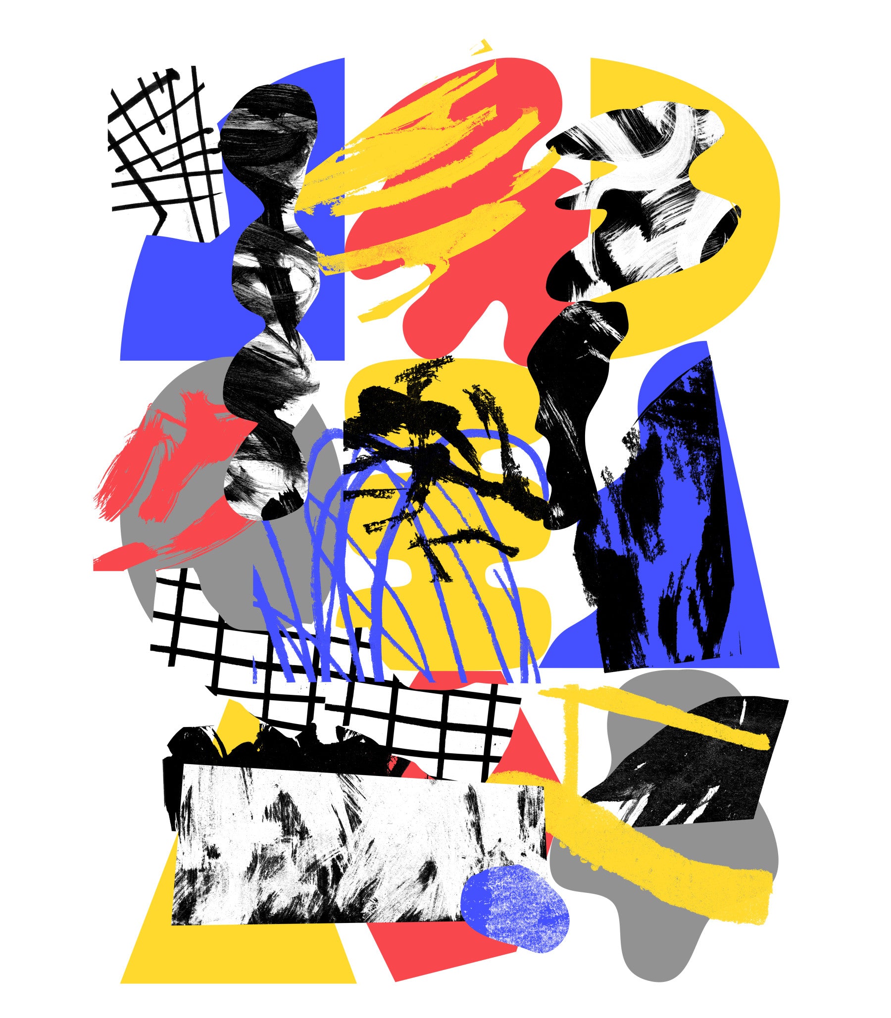 Transform your walls into a contemporary masterpiece. The design showcases bold geometric forms with vibrant hues of yellow, red, blue and black. Energetic brushstrokes complement the stark shapes, creating a visually dynamic contrast. This is a fantastic wallpaper for walls in a modern living room, trendy office, or creative studio. It sparks imagination and sets a contemporary tone. Brighten your space with this energizing design. Embrace the abstract with this stunning pattern.
