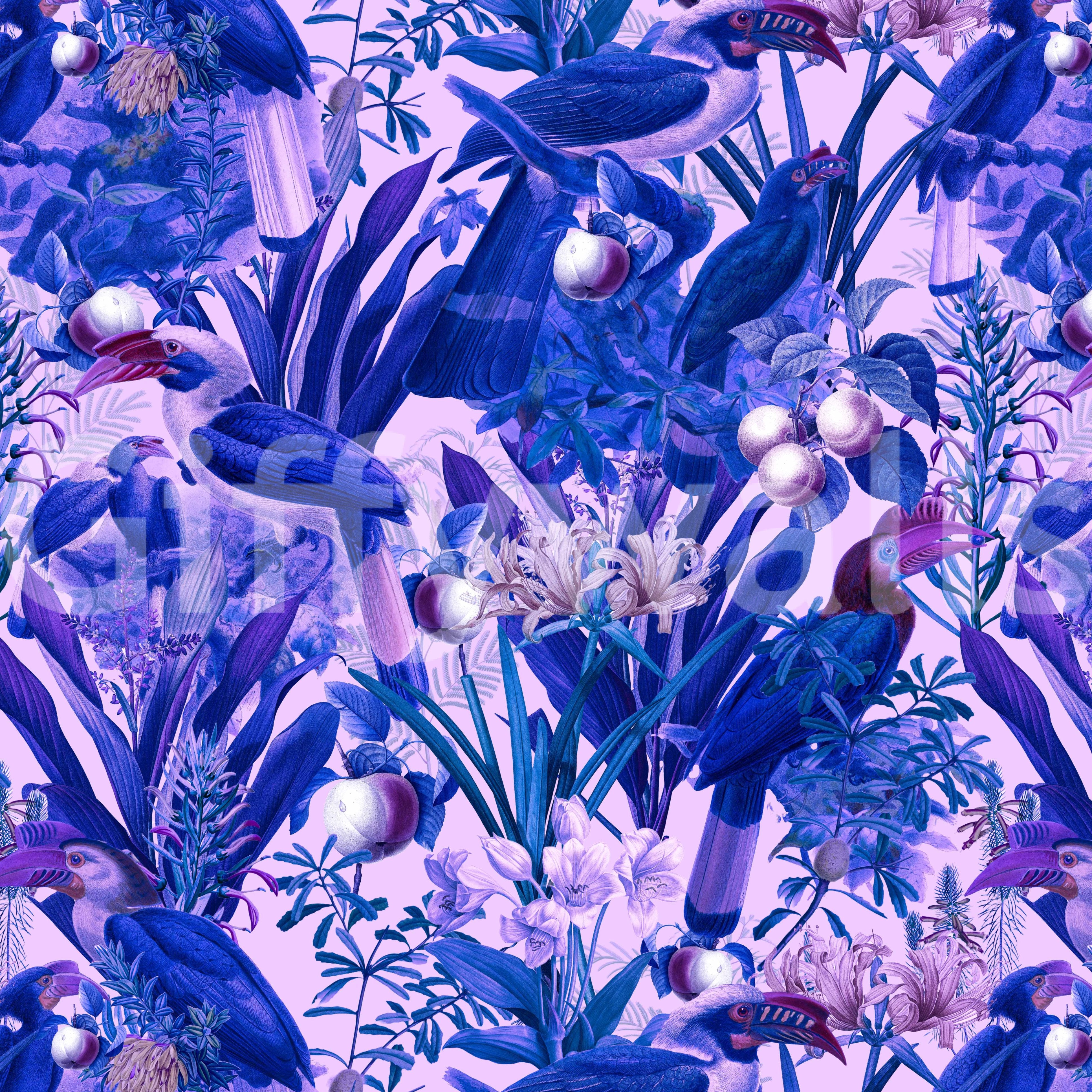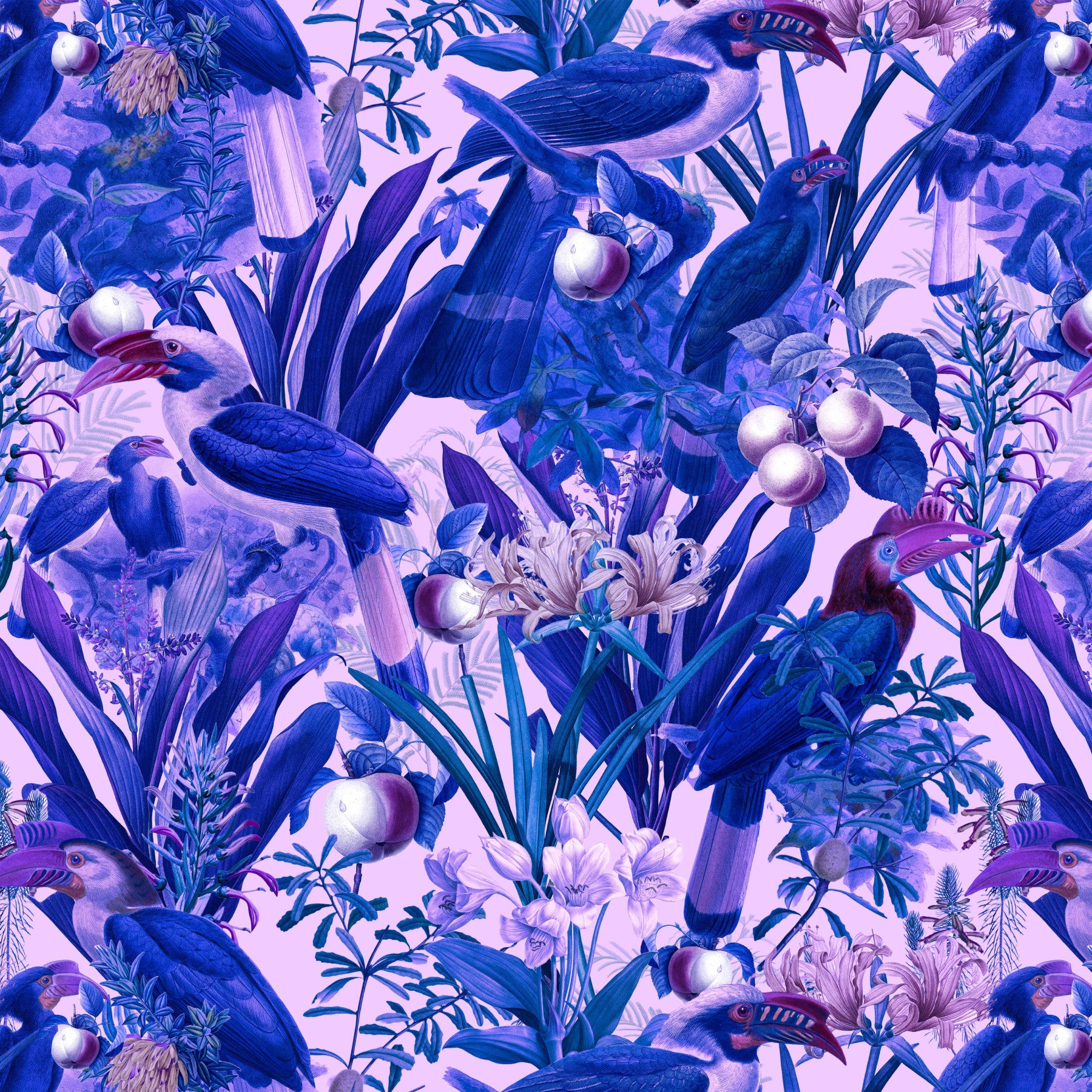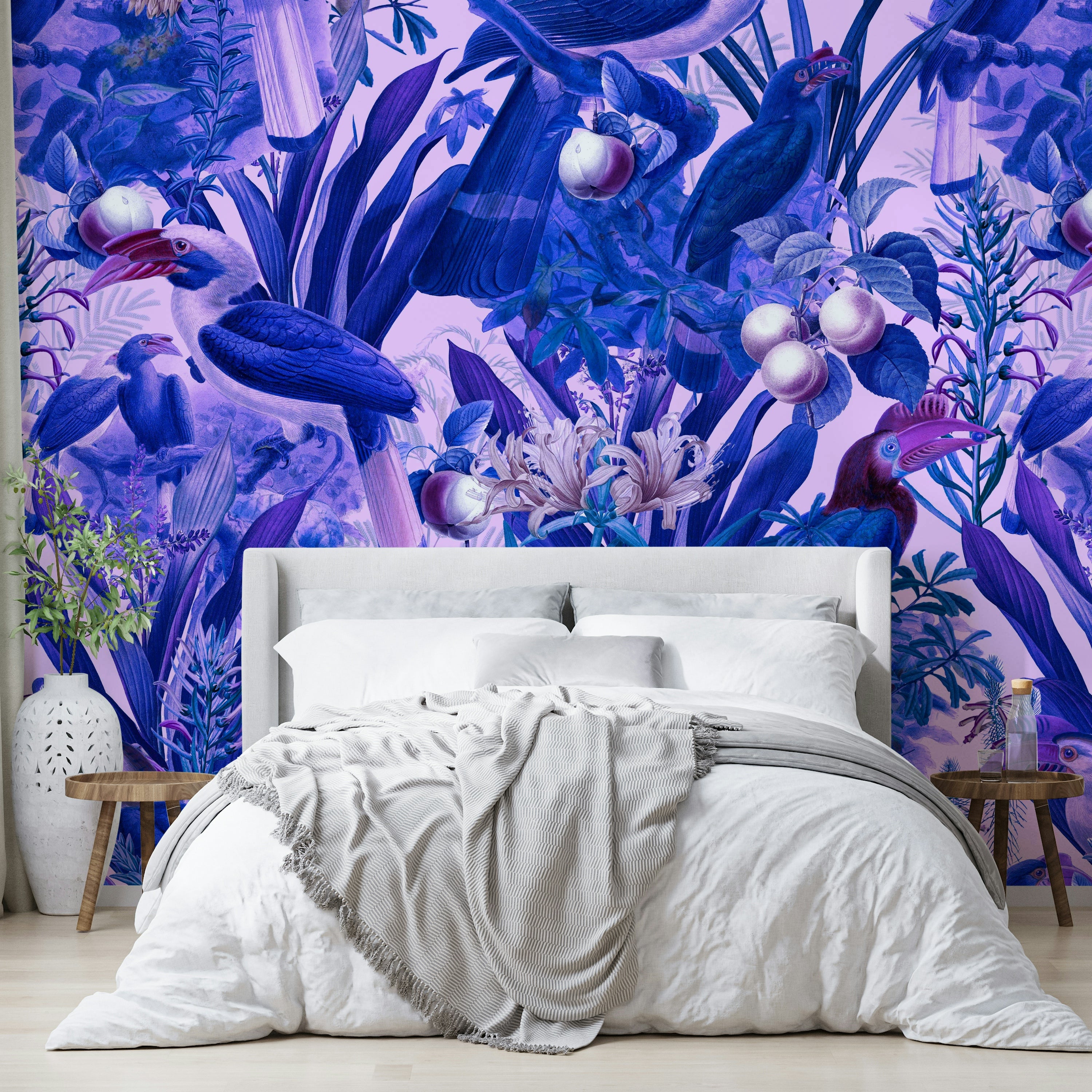 Immerse yourself in the mystical 'Purple Jungle,' a vibrant wallpaper design where exotic hornbills perch amongst lush, deep purple foliage. Intricate botanical details, including striking lilies and glistening fruits, add depth and texture to this captivating scene. The monochromatic color palette creates a dreamlike atmosphere, perfect for adding a touch of surreal elegance to any digital device. This wallpaper evokes a sense of tranquility and mystery, transporting you to a hidden world of vibrant flora and fauna rendered in a rich, enchanting purple hue. The seamless pattern ensures a captivating visual experience, no matter the screen size.