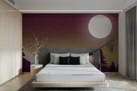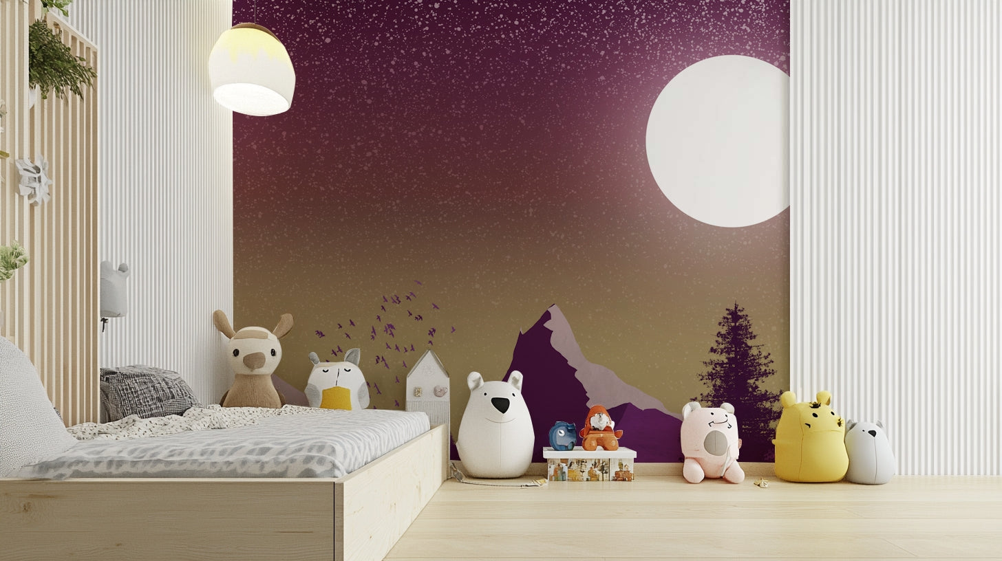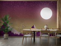 This wallpaper, titled 'Purple Peaks Under the Moon,' captures a stunningly simple yet evocative scene. The deep purple mountains are silhouetted against a textured, star-dusted sky, with a large, bright moon illuminating the landscape. The inclusion of a flock of birds adds a sense of motion and life to the otherwise serene scene. The color palette is sophisticated and calming, ideal for creating a peaceful and reflective ambiance on your digital devices. The image is perfectly balanced, offering a sophisticated yet easily digestible aesthetic.