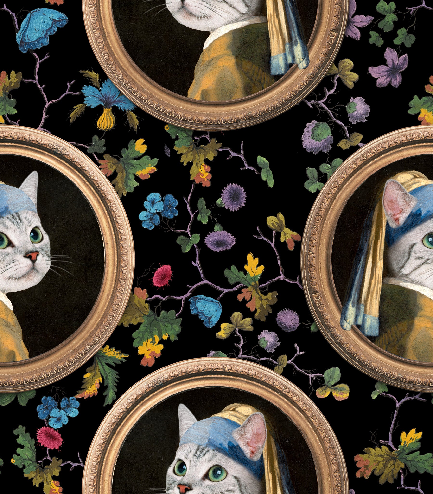 Elevate your space with this artistic wallpaper for walls featuring feline portraits reminiscent of classical paintings by Uta Naumann. Each cat is framed in ornate gold, set against a dark backdrop adorned with colorful floral designs. The wallpaper blends humor with high art, making it a unique and stylish choice. It's a great conversation starter, ideally suited for a living room, dining area, or hallway, and adds a touch of whimsy and elegance to any interior.