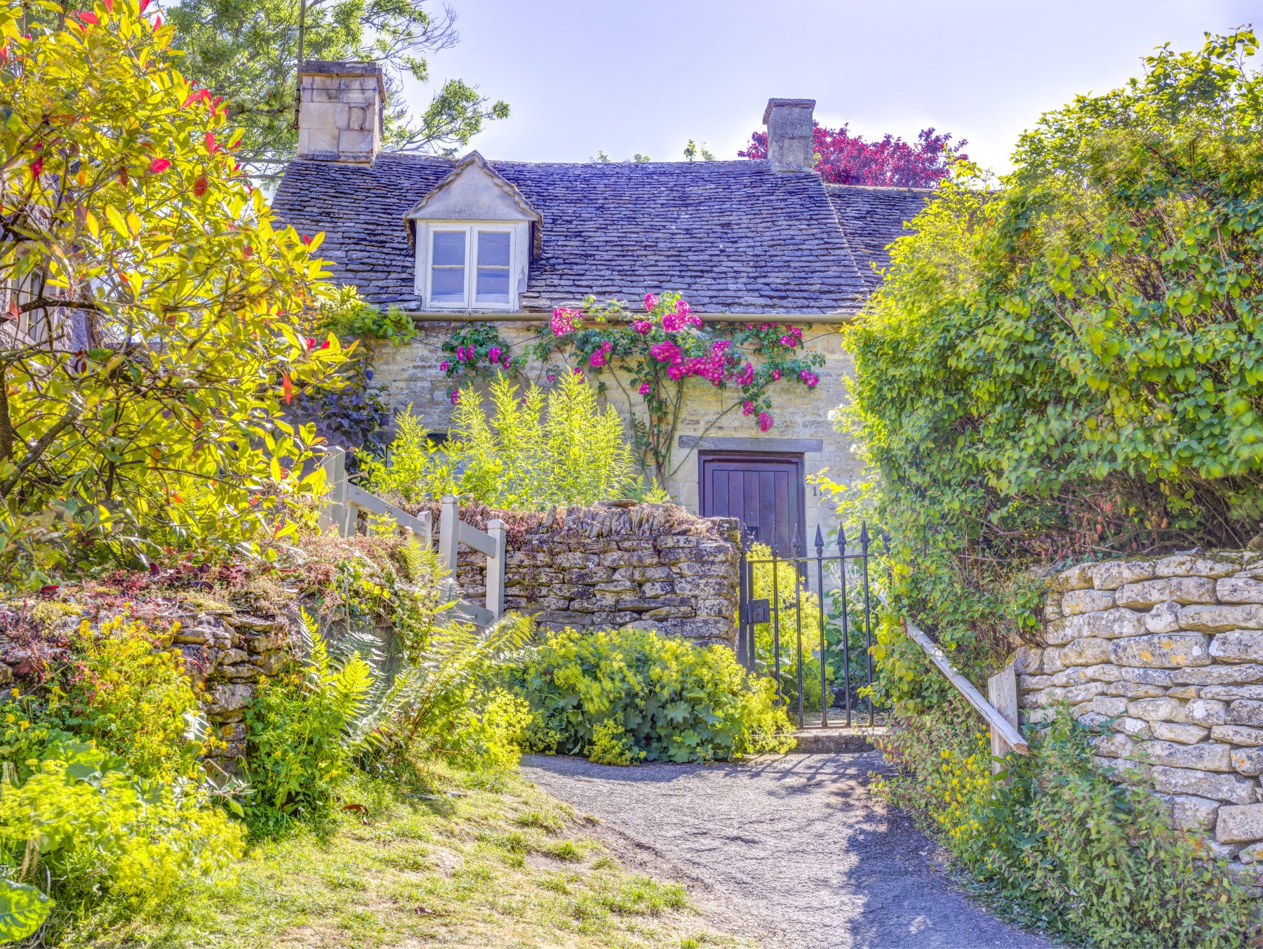 Old Cottages in Bibury village, Gloucestershire, UK. Capture the essence of a peaceful village with this captivating wallpaper. It presents a stone cottage embraced by climbing roses and flourishing greenery, exuding a classic charm. The blend of natural tones and soft pinks offers visual warmth. Apply this wallpaper for walls to transform bedrooms, living areas, or dining spaces into tranquil escapes. It works beautifully with rustic, vintage, or botanical-inspired interiors, creating a welcoming and comforting ambiance.