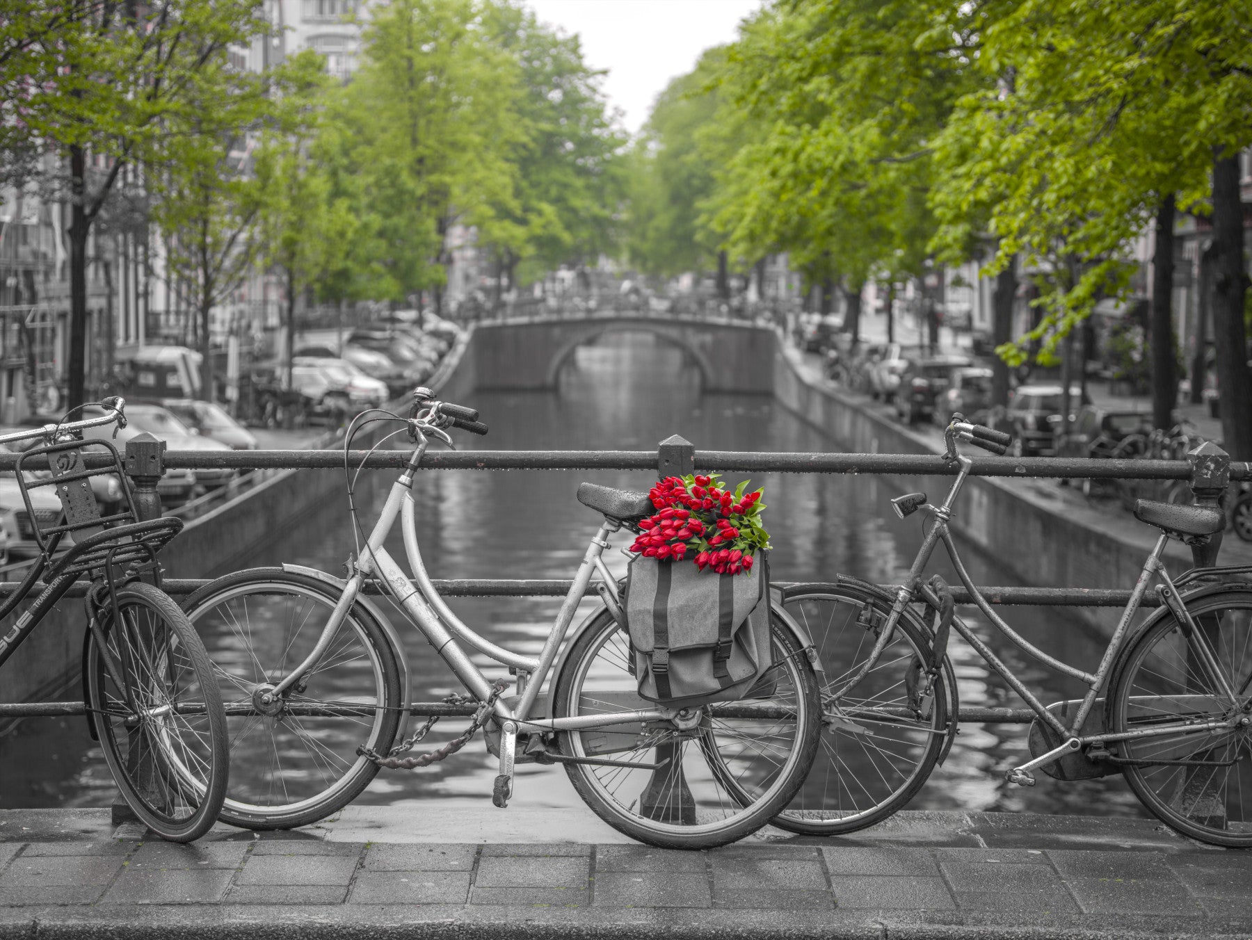 A beautiful bicycle with a bouquet of red tulips on an Amsterdam canal bridge.