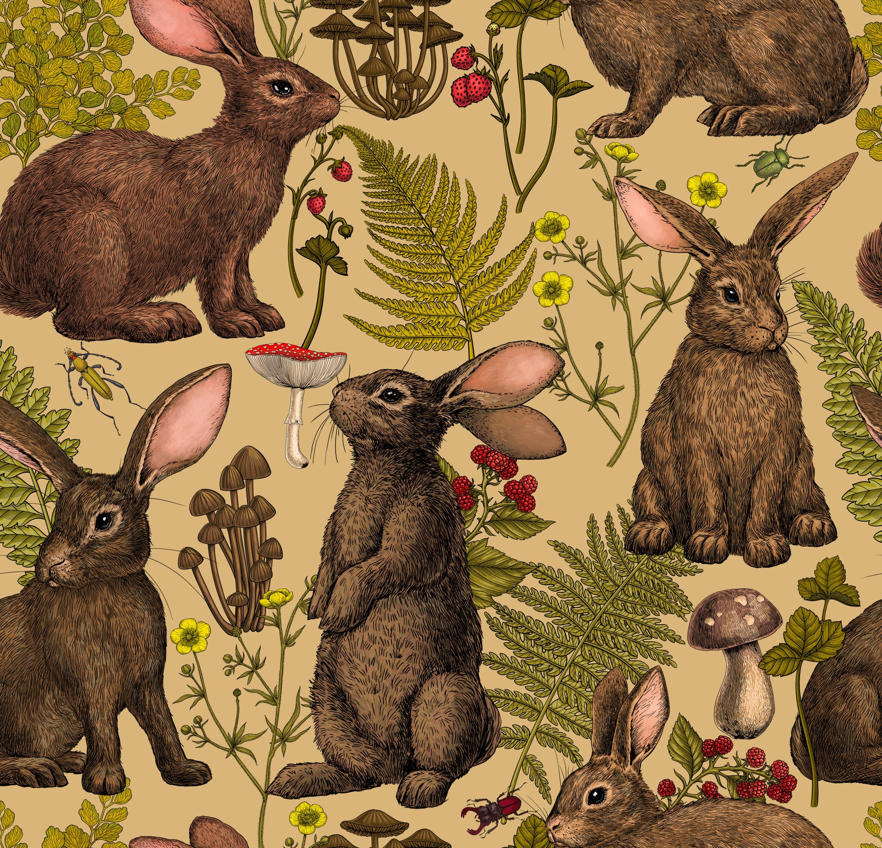 Subtle berry and insect details in the Rabbits and woodland flora Wallpaper.