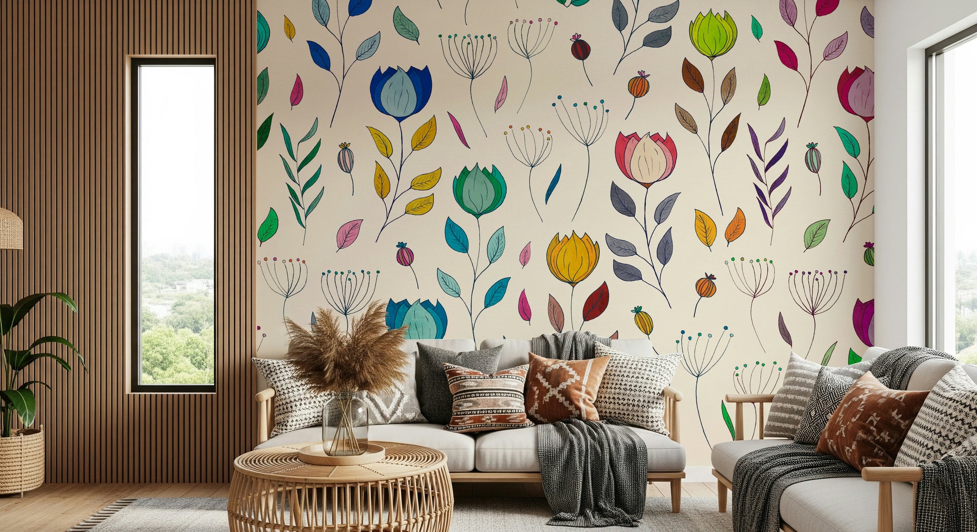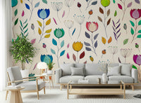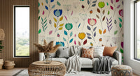 Adorn your space with this cheerful floral wallpaper for walls. It showcases colorful, hand-drawn flowers and leaves on a light backdrop. This playful pattern will bring a fresh and vibrant feel to any room. The range of colors, including blues, greens, yellows, and pinks, ensures that it complements a variety of interior styles, from modern to boho. Consider this design for a kid's room, bedroom, or living area to create an inviting and joyful atmosphere. The intricate details and lively color palette will surely elevate your decor.