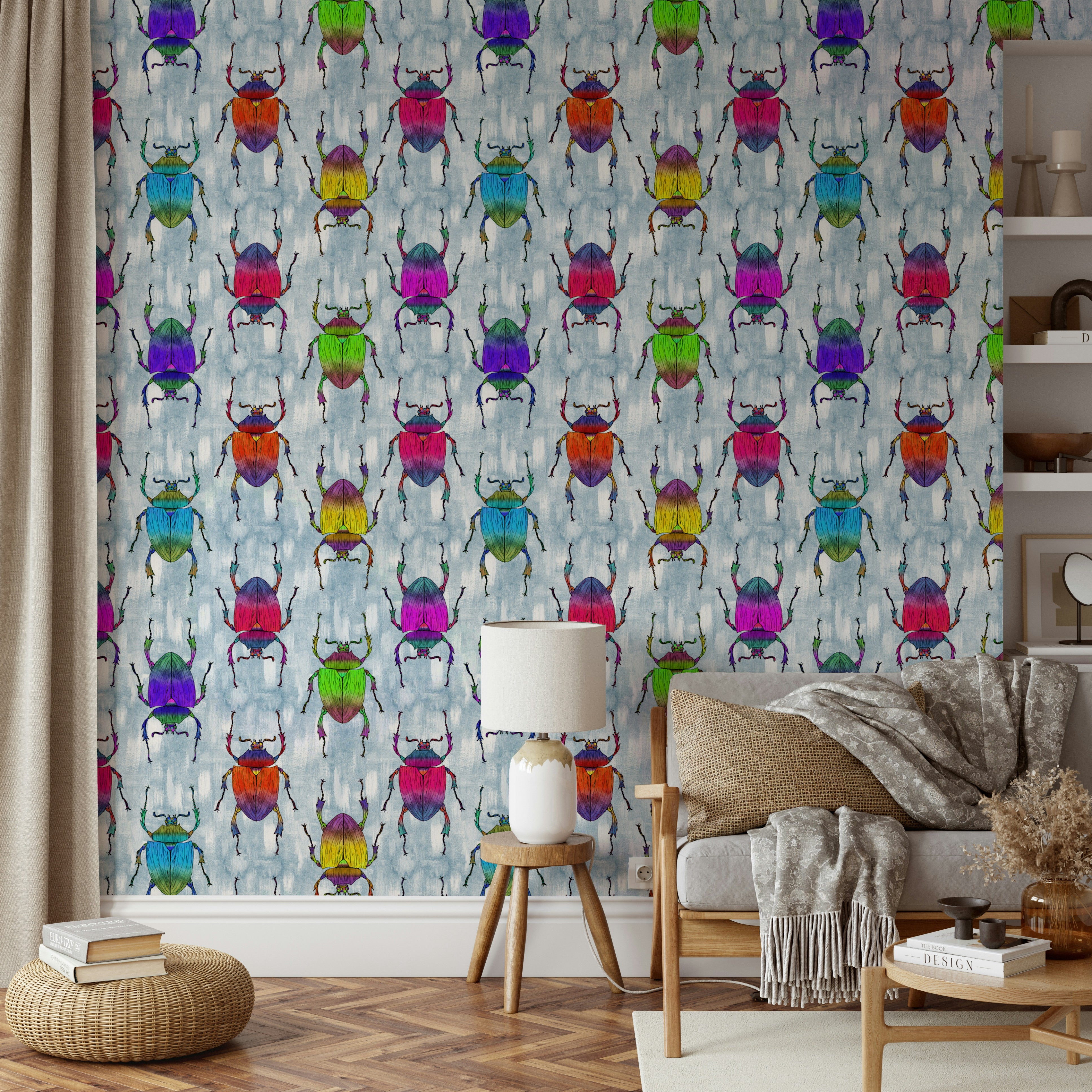 Rainbow beetles and butterflies on cheerful blue wallpaper.