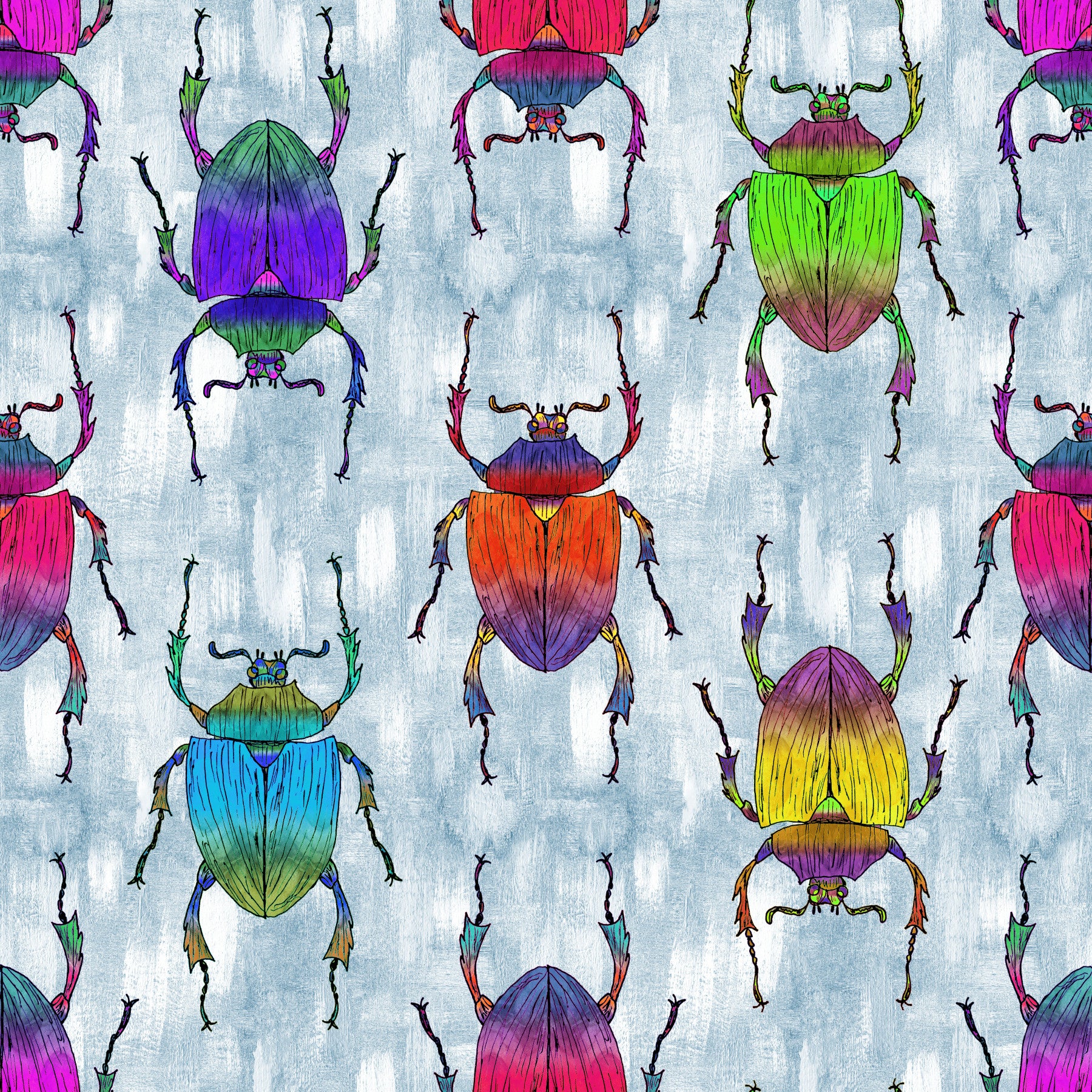 Blue wallpaper with rainbow-colored bugs in playful patterns.
