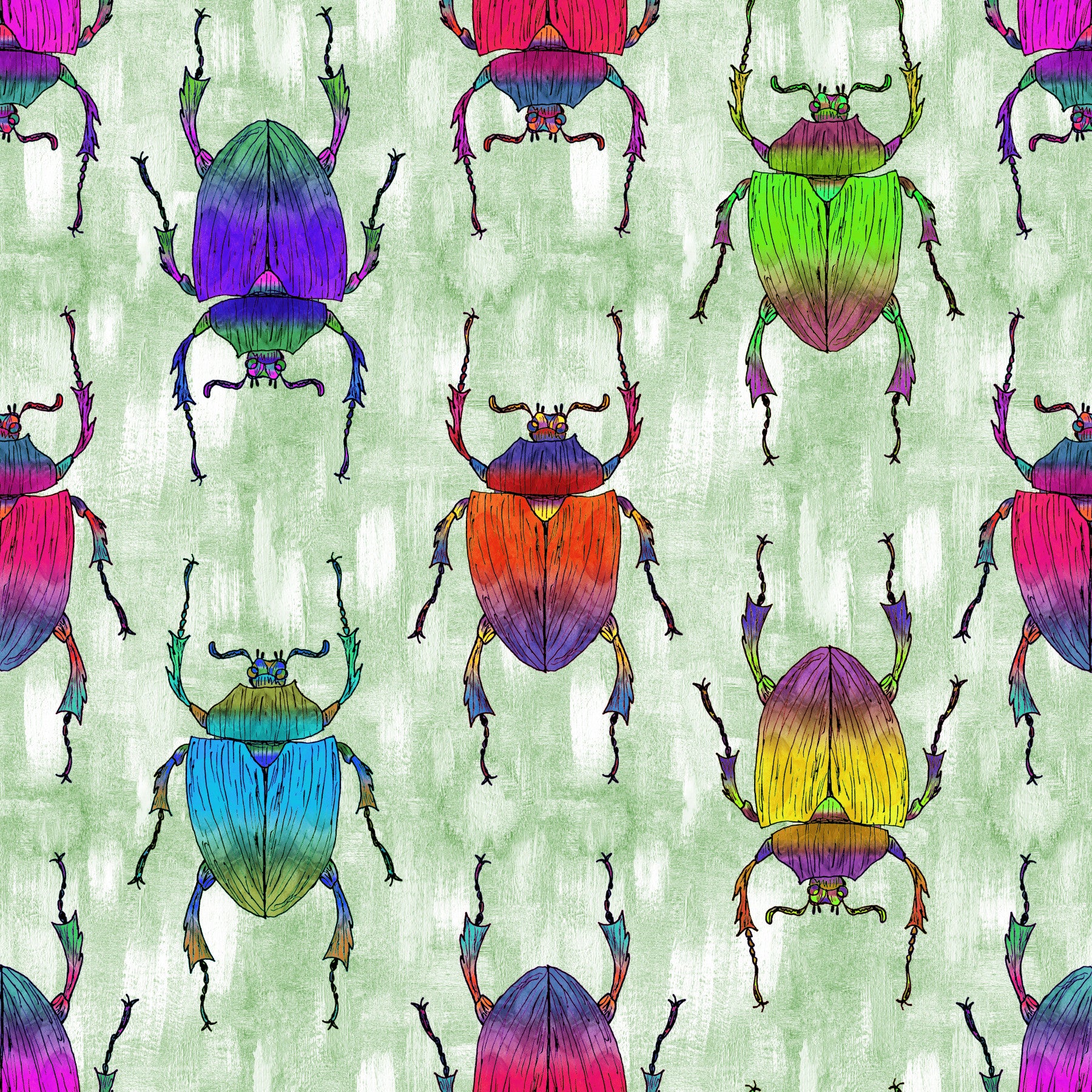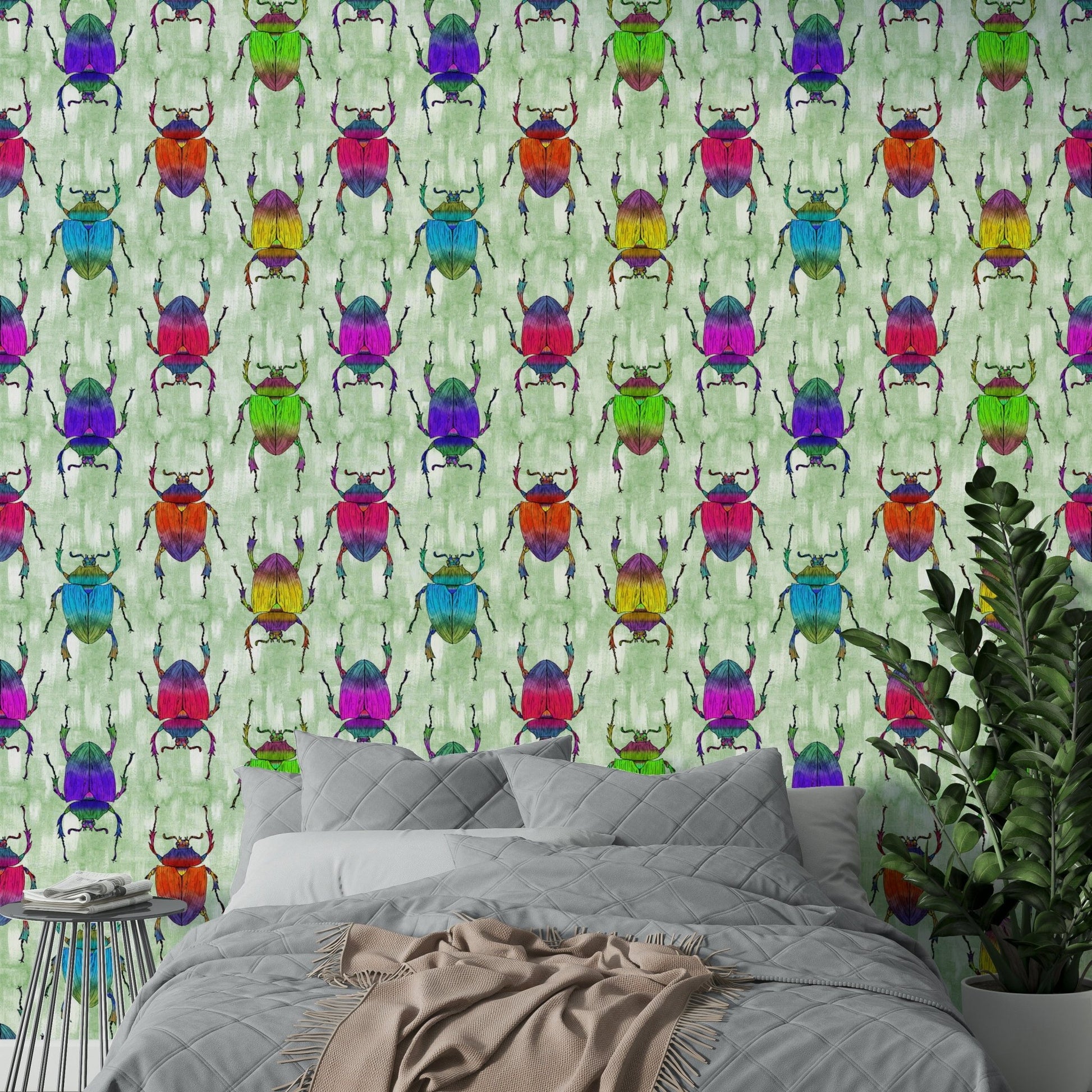 Dive into a vibrant world of iridescent insects with this captivating wallpaper. A soft, textured green background provides the perfect canvas for a dazzling array of rainbow-hued beetles. Each bug is meticulously detailed, showcasing a spectrum of colors that shift and shimmer, creating a mesmerizing visual effect. The stylized artwork offers a unique blend of nature and fantasy, bringing a playful yet sophisticated touch to any digital device. This wallpaper is perfect for those seeking a whimsical, eye-catching design with a touch of artistic flair. The repeating pattern ensures a seamless and visually stunning experience on any screen size.