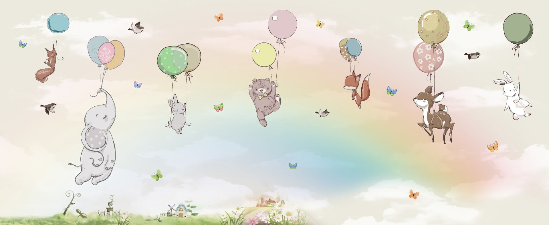 Transform your child's room into a whimsical adventure sky with the flying animals with balloons kids room wallpaper mural. The charming animals float through the air with colourful balloons, creating a delightful design that sparks creativity and joy in nurseries, bedrooms, and play areas. The soft pastel tones and intricate details create a soothing yet playful atmosphere that complements any decor. Made from high-quality materials, this wallpaper is available in peel-and-stick and traditional options, ensuring easy installation and lasting durability. Let your little one's imagination take flight with this enchanting mural!