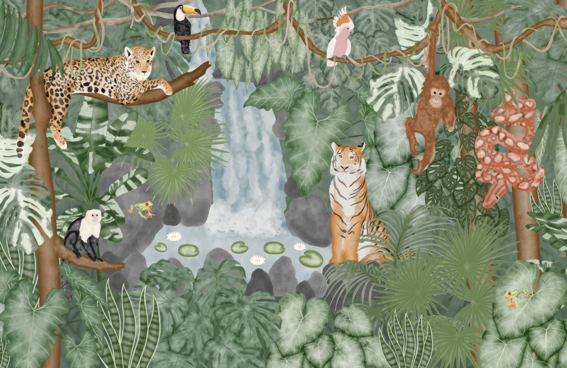 Tropical rainforest mural with exotic animals