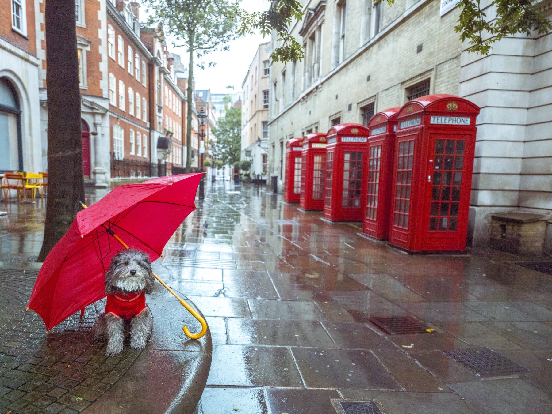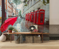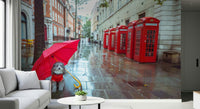 Bring a touch of London charm to any space with this delightful wallpaper. It features a cute dog sheltering under a bright red umbrella against the backdrop of iconic British telephone boxes and wet cobblestones. The scene evokes a serene and slightly whimsical mood. This wallpaper for walls adds a pop of color and personality to your decor. Imagine it brightening up a hallway, kid's room, or even a modern home office. The design blends well with various interiors, from contemporary to classic, adding a unique touch to any space. Let this delightful scene transform your walls.
