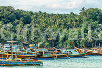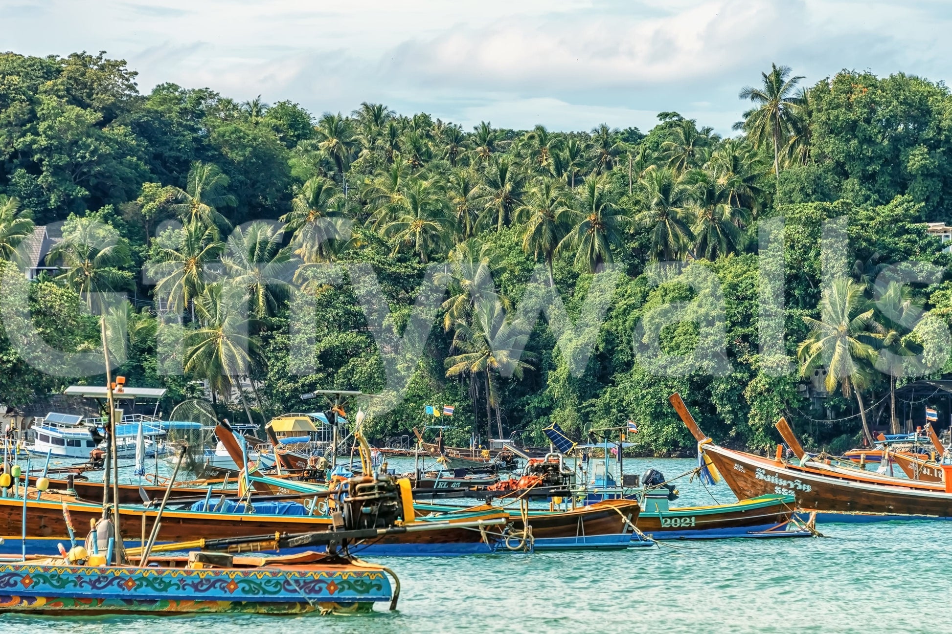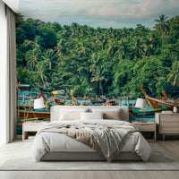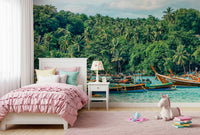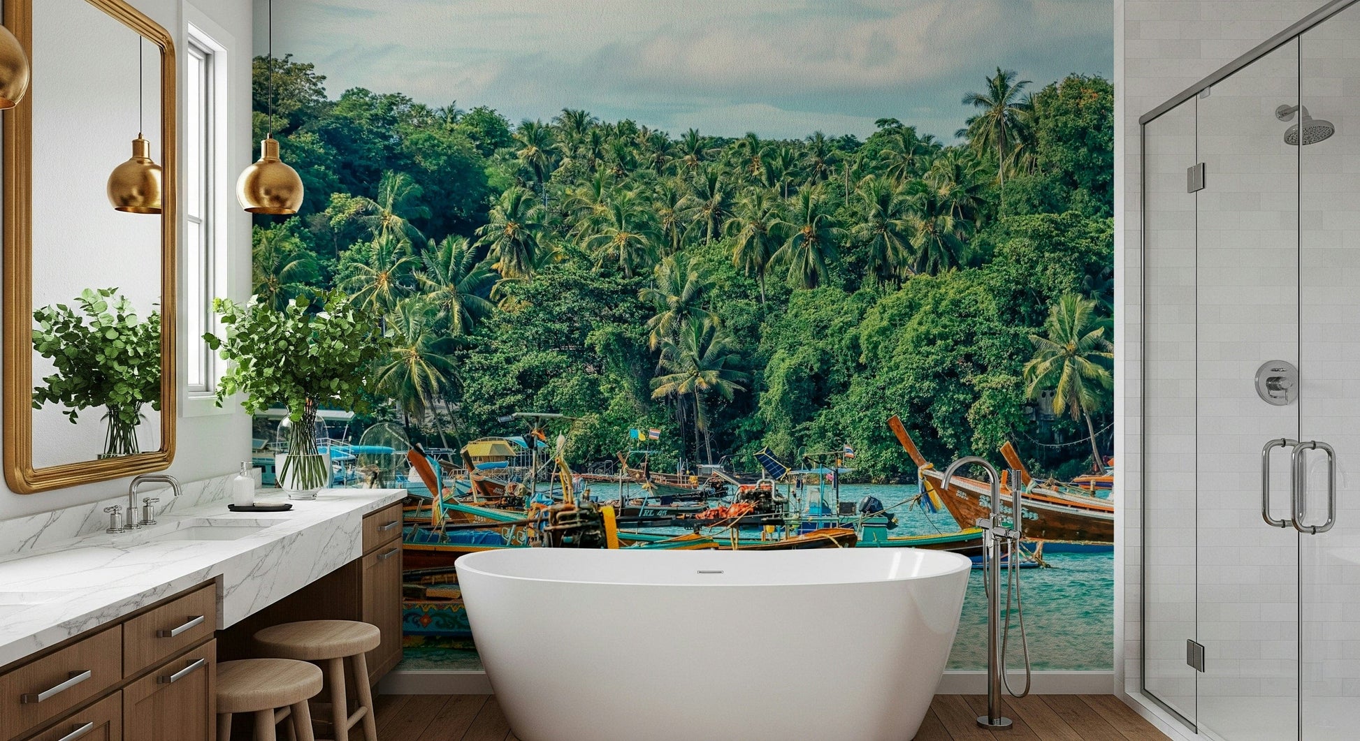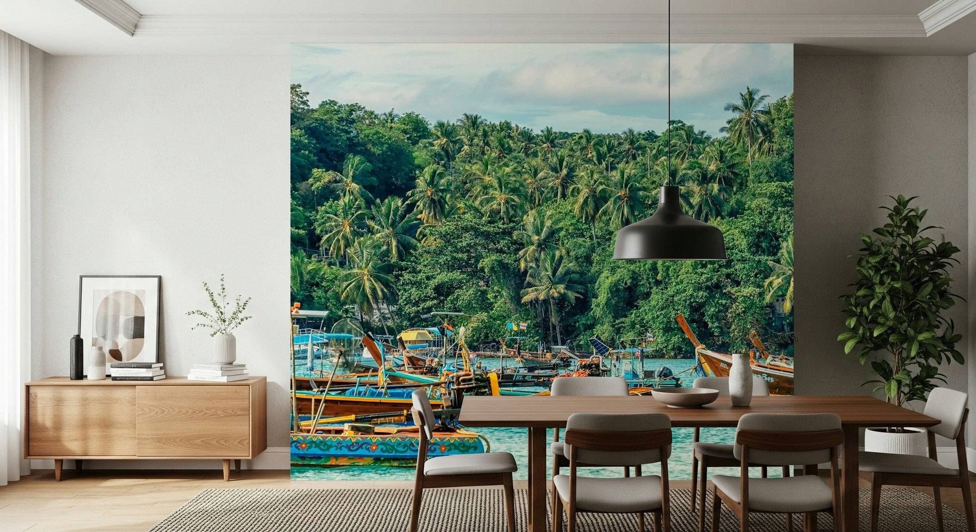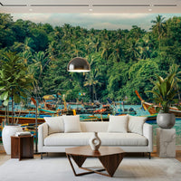 Elevate your home's atmosphere with this captivating coastal scene. This tropical harbor wallpaper for walls features colorful Thai boats gently floating in turquoise water, embraced by lush green palm trees. The vibrant hues create an inviting and relaxed ambiance, ideal for any room in your home. It is perfect for a living room, bedroom, or even a home office. This wallpaper adds a fresh, tropical touch that harmonizes with various interior styles, creating a statement wall with coastal charm and enhancing your living space.