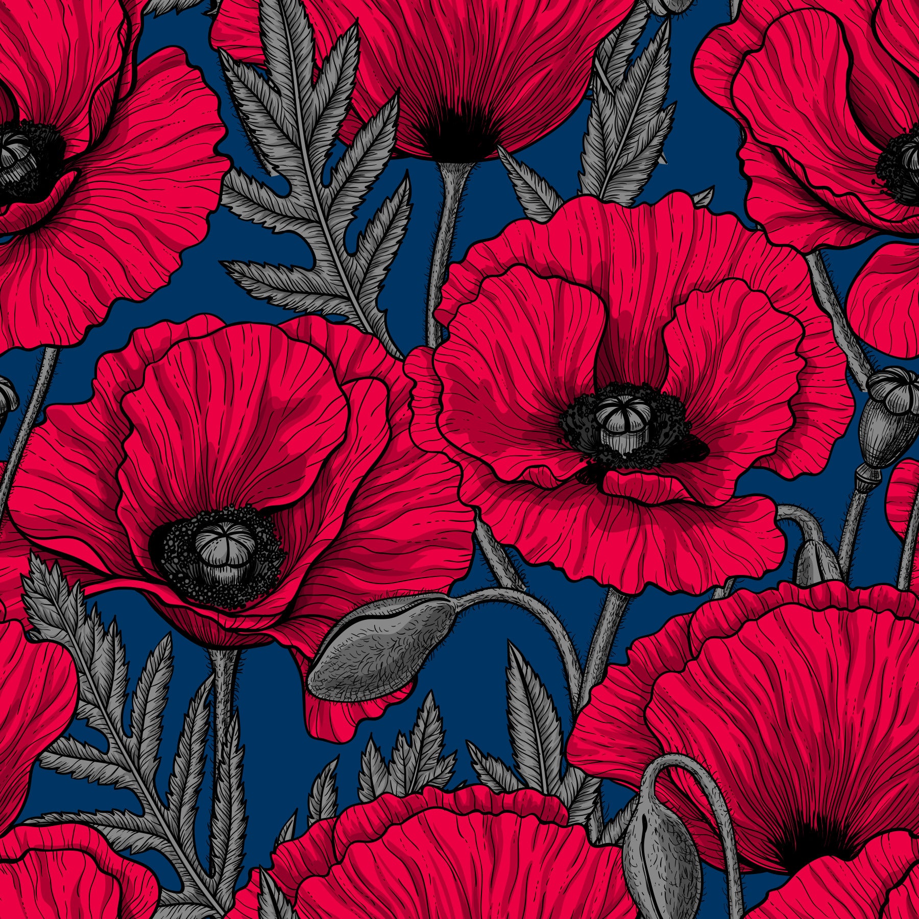 Immerse yourself in the vibrant beauty of this wallpaper featuring a captivating array of red poppies against a rich dark blue backdrop. Intricate details showcase the delicate texture of each petal, while the contrasting grey-toned foliage adds depth and visual interest. This striking design creates a mood that is both dramatic and elegant, offering a sophisticated floral statement perfect for any wall. The bold color palette and detailed botanical illustrations make this wallpaper a captivating and eye-catching choice. Experience the rich contrast and refined artistry of nature's splendor.