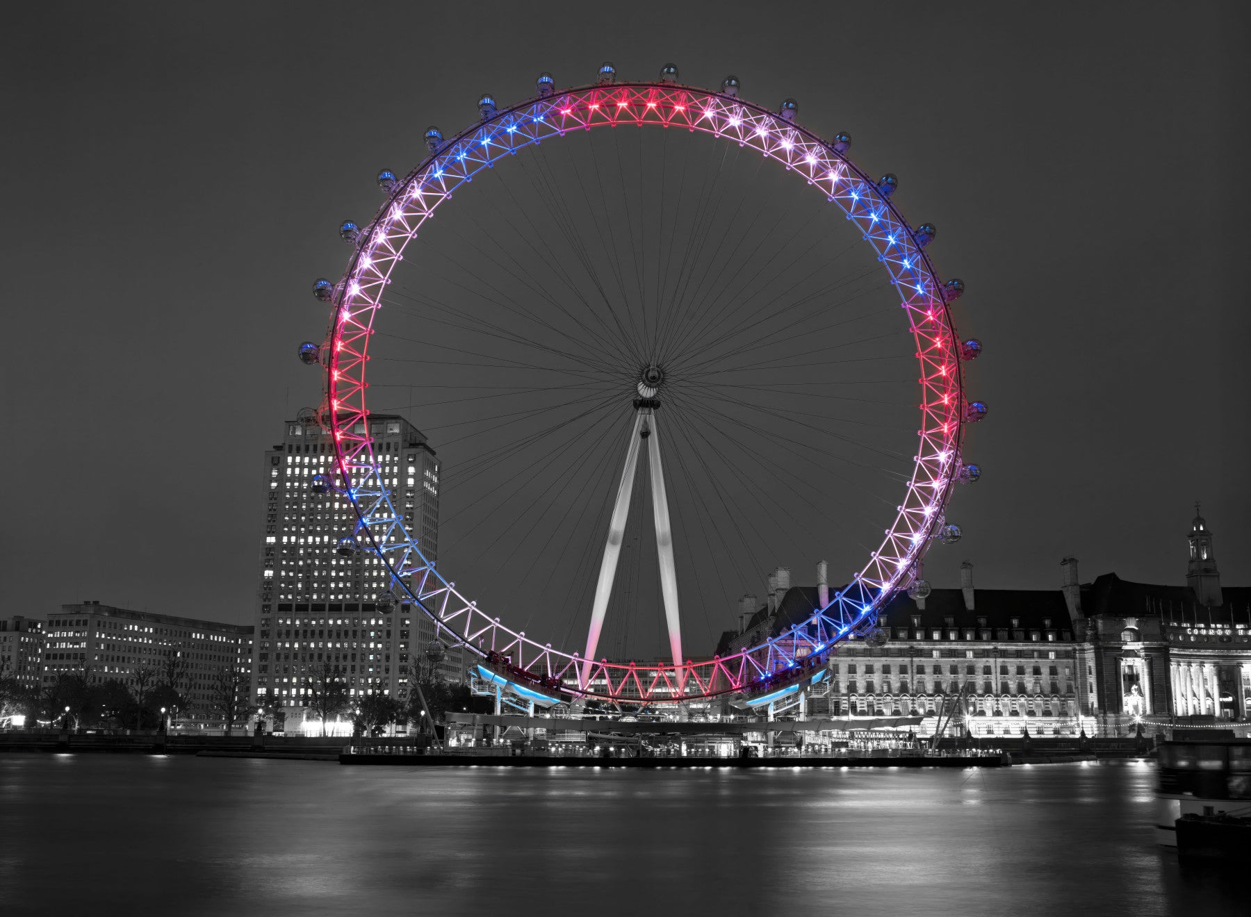 Gaze into the heart of London with "Reflecting Eye," a mesmerizing wallpaper that captures the iconic London Eye against a dramatic, grayscale cityscape. The wheel, illuminated in vibrant hues of red and blue, stands as a beacon of modern marvel and a mirror to the city's pulsating energy. The monochromatic backdrop accentuates the vivid colors, drawing your eye and creating a captivating focal point. Watch as the still water reflects the vibrant lights, creating a sense of depth and an opportunity for contemplation. This wallpaper evokes a sense of wonder and adventure. Transform your digital space into a window overlooking the captivating skyline of London with this contemporary, eye-catching design.