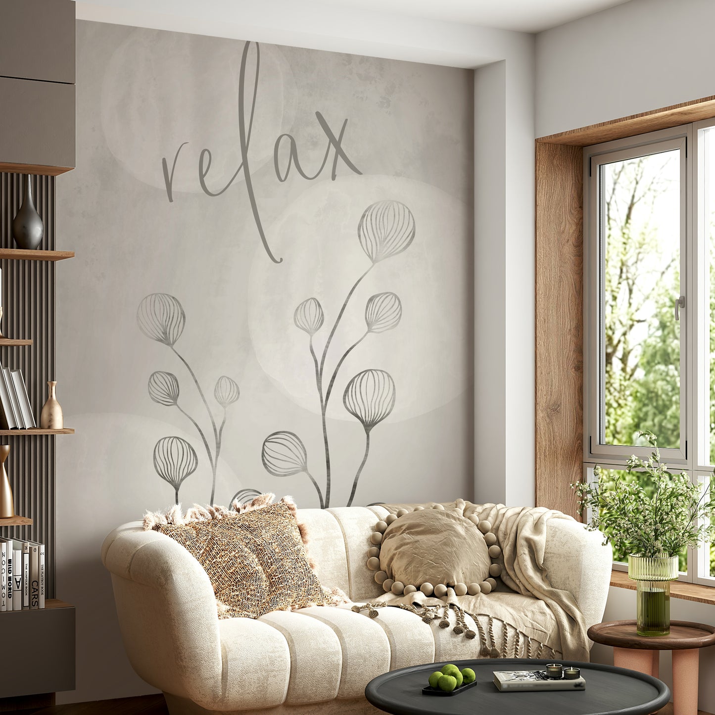 Embrace serenity with this "Relax - Japandi Style" wallpaper. A minimalist design featuring the word "relax" in flowing script gracefully placed above delicate, stylized floral branches. The soft, neutral color palette creates a sense of calm and tranquility, while the watercolor-like textures add subtle depth and visual interest. This wallpaper embodies the Japandi aesthetic—the harmonious blend of Japanese minimalism and Scandinavian warmth. It's perfect for creating a peaceful and inviting atmosphere in any room, encouraging moments of mindfulness and reflection.
