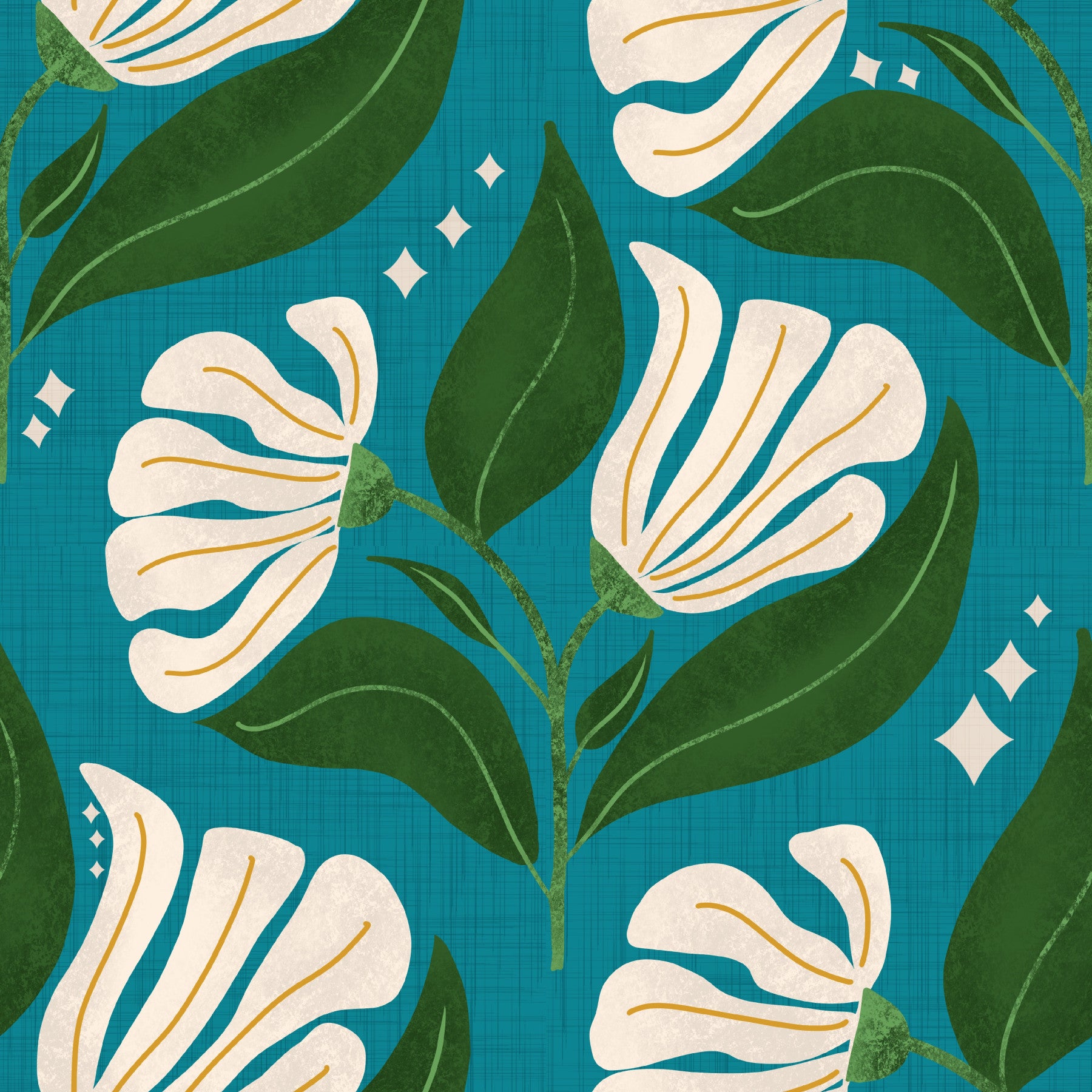 Step back in time with this 'Retro 70s Cream Florals on Avocado Teal' wallpaper, a vibrant homage to the groovy era! Bold and beautiful, this design features stylized, oversized cream-colored flowers with warm yellow accents, set against a rich avocado teal background. The textured backdrop adds depth and authenticity to the vintage vibe, reminiscent of classic 70s textiles. Lush green leaves intermingle with the blooms, creating a lively and organic feel. Sparkling diamond accents are scattered throughout the floral design, adding a touch of whimsy. This wallpaper is perfect for creating a statement wall, adding a touch of retro charm to any room, or infusing your space with a nostalgic, yet fresh, aesthetic. Embrace the bold spirit of the 70s with this captivating floral design!