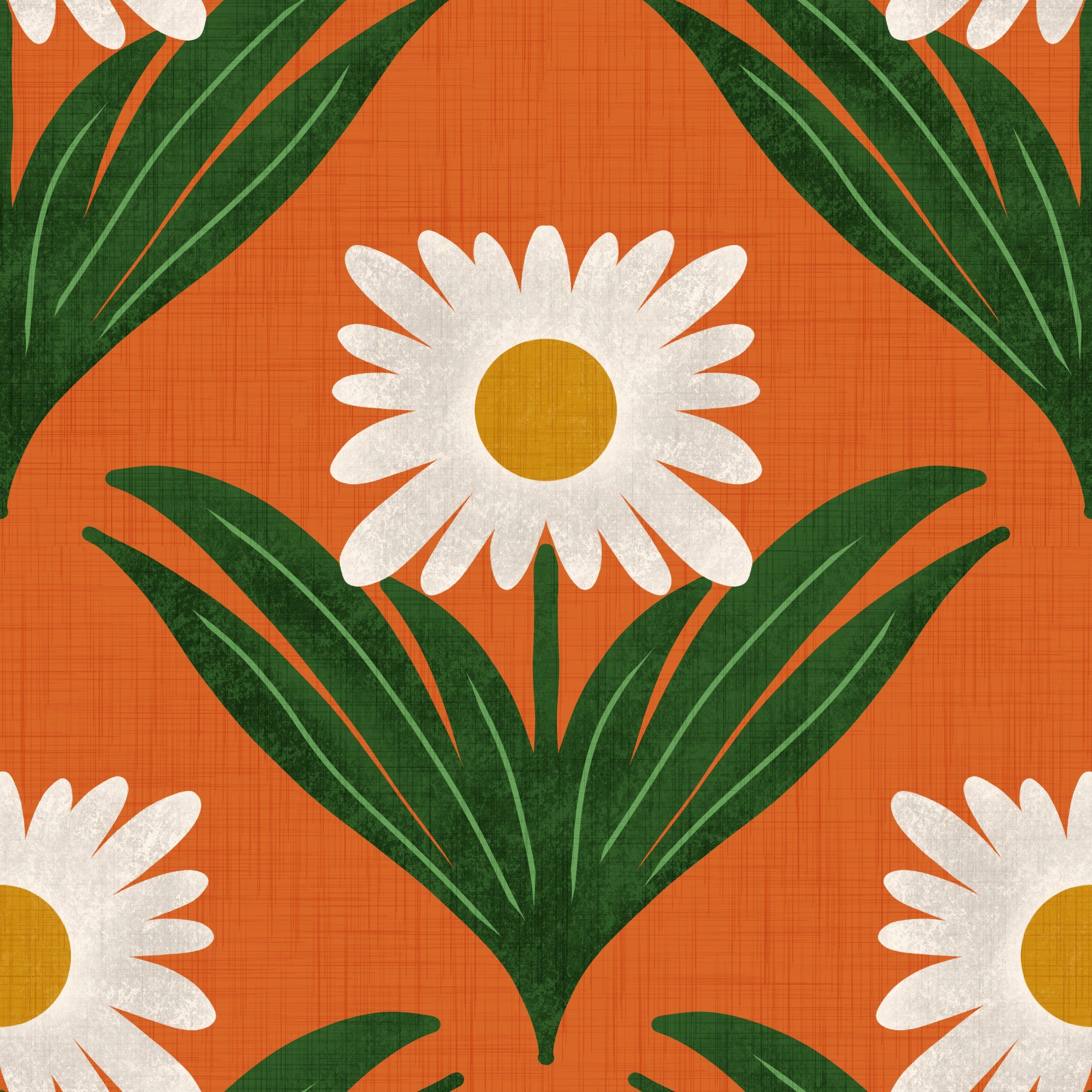 Groove into the past with this Retro 70s Daisy Floral wallpaper! Bursting with vintage charm, this design features a bold and cheerful orange backdrop adorned with stylized white daisies and lush green foliage. The repeating pattern evokes the iconic mod aesthetic of the 1970s, offering a playful yet sophisticated touch to any space. The simplified floral shapes and vibrant color palette bring a sense of joy and nostalgia, creating a warm and inviting atmosphere. Perfect for adding a pop of retro flair to bedrooms, living rooms, or even accent walls, this wallpaper is sure to transport you back to the era of flower power and good vibes. Embrace the groovy spirit of the 70s and let this daisy floral wallpaper brighten your world!