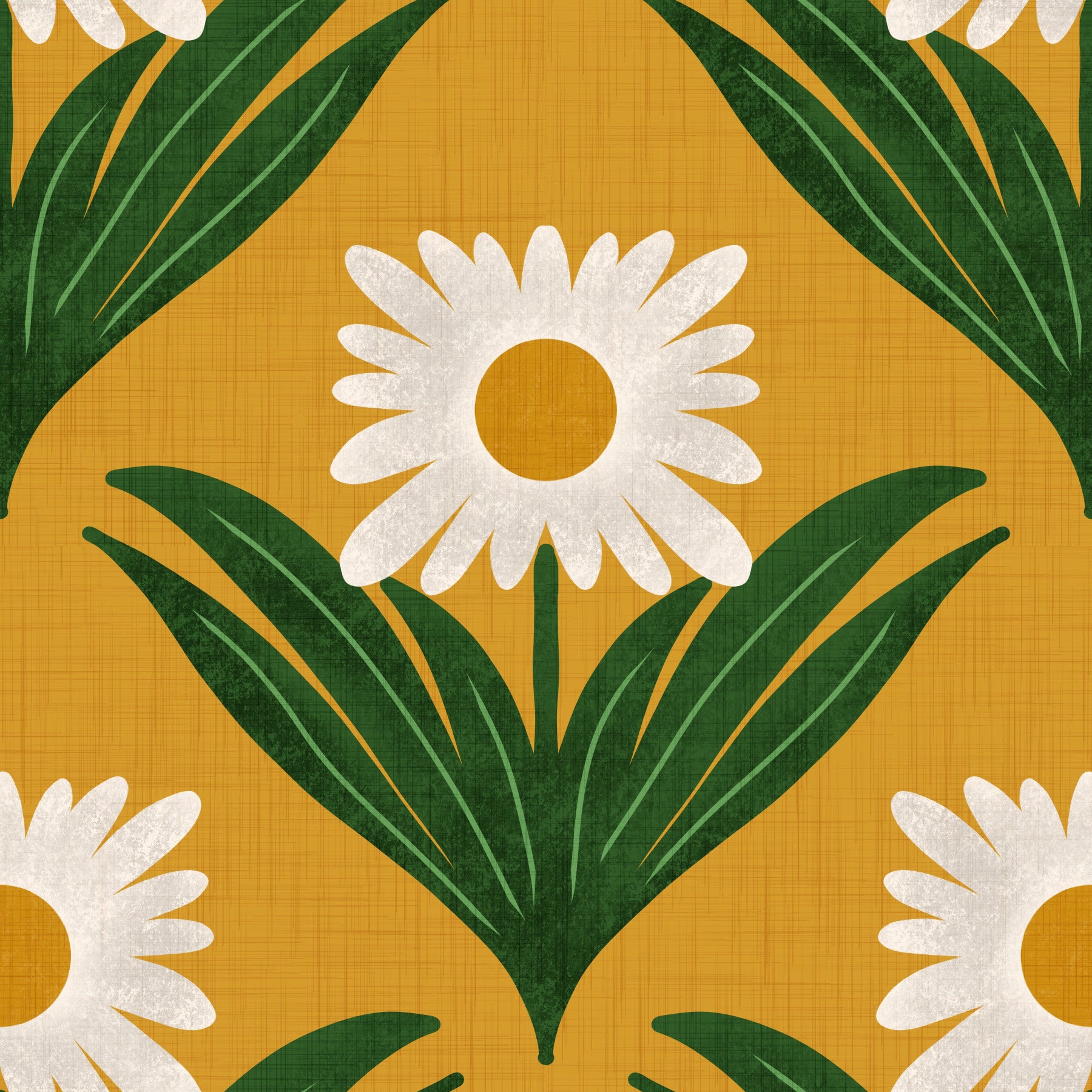 Groove into the past with our Retro 70s Daisy Floral on Yellow wallpaper. This design is a vibrant throwback to the iconic era of bold patterns and cheerful palettes. Bold, stylized daisies with crisp white petals and sunny yellow centers stand proudly against a warm, golden-yellow background. The rich green leaves add depth and a touch of natural elegance to this mod floral arrangement. With a slightly textured effect, it evokes a sense of vintage charm and tactile appeal. Perfect for creating a retro-chic ambiance in any room, this wallpaper brings a playful yet sophisticated vibe, transforming your space into a stylish sanctuary of the 70s. Embrace the nostalgia and let the good times bloom!