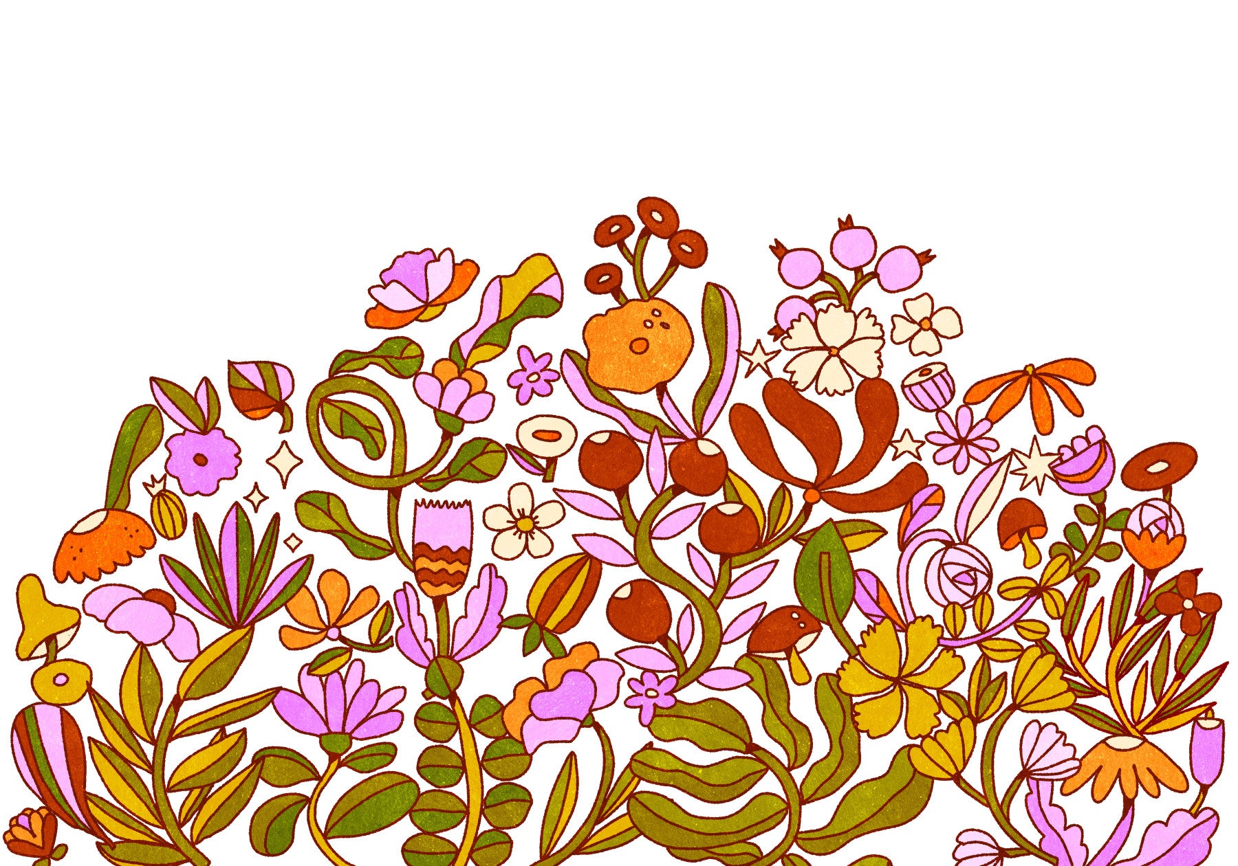 Embrace a nostalgic vibe with this retro-inspired floral wallpaper. The design features a whimsical collection of hand-drawn flowers and plants in a vibrant palette of 70s-inspired oranges, yellows, greens, and purples. Each bloom is uniquely detailed, creating a joyful and energetic atmosphere. The playful style is perfect for adding a touch of vintage charm to any room, from a living room or bedroom to a child's playroom. Let the cheerful colors and intricate details transport you back to a simpler time, while simultaneously infusing your space with a modern and artistic feel. This wallpaper is ideal for adding a burst of personality and color to any wall.