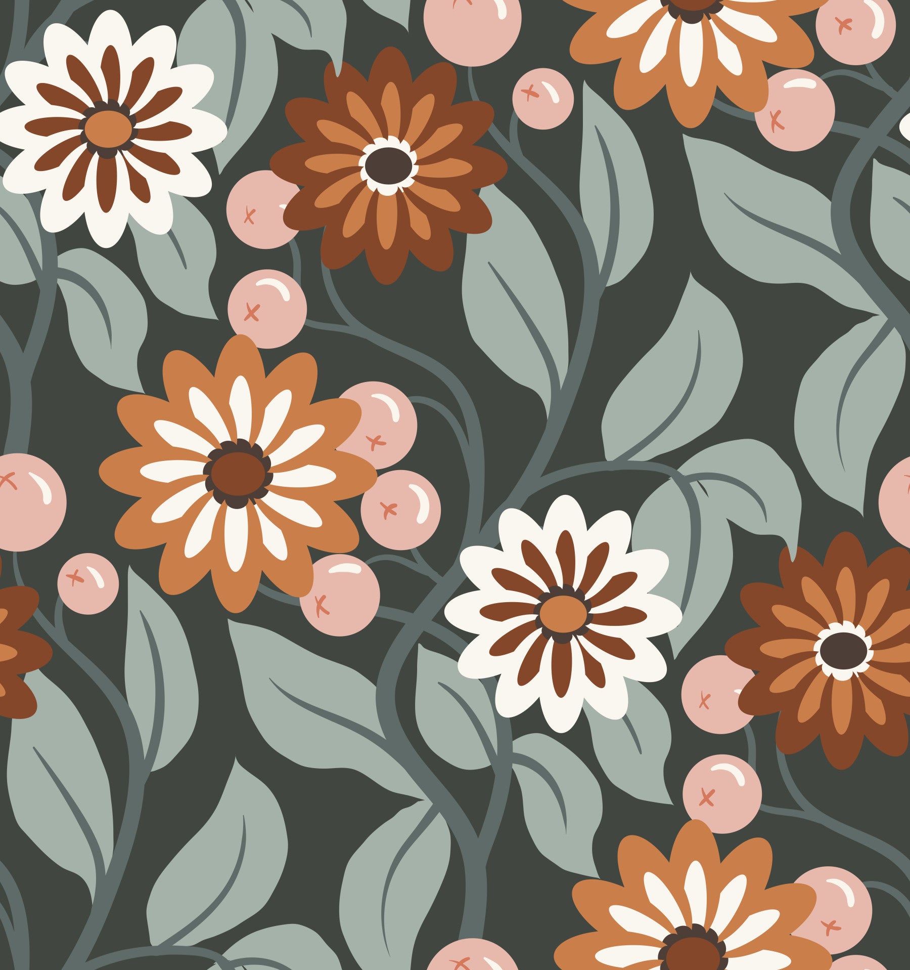 Immerse yourself in the nostalgic charm of 'Retro Bloom,' a wallpaper design that seamlessly blends vintage aesthetics with modern sensibilities. The captivating pattern showcases stylized flowers in warm, earthy tones of burnt orange, terracotta, and soft blush pink, playfully interspersed with delicate, muted green leaves. The dark olive-green background provides a rich contrast, enhancing the vibrancy of the floral motifs. This wallpaper offers a calming yet energetic vibe, perfect for adding a touch of retro sophistication to any room. Its seamless design ensures a cohesive and elegant look, whether used in a living room, bedroom, or as a statement piece in a hallway.