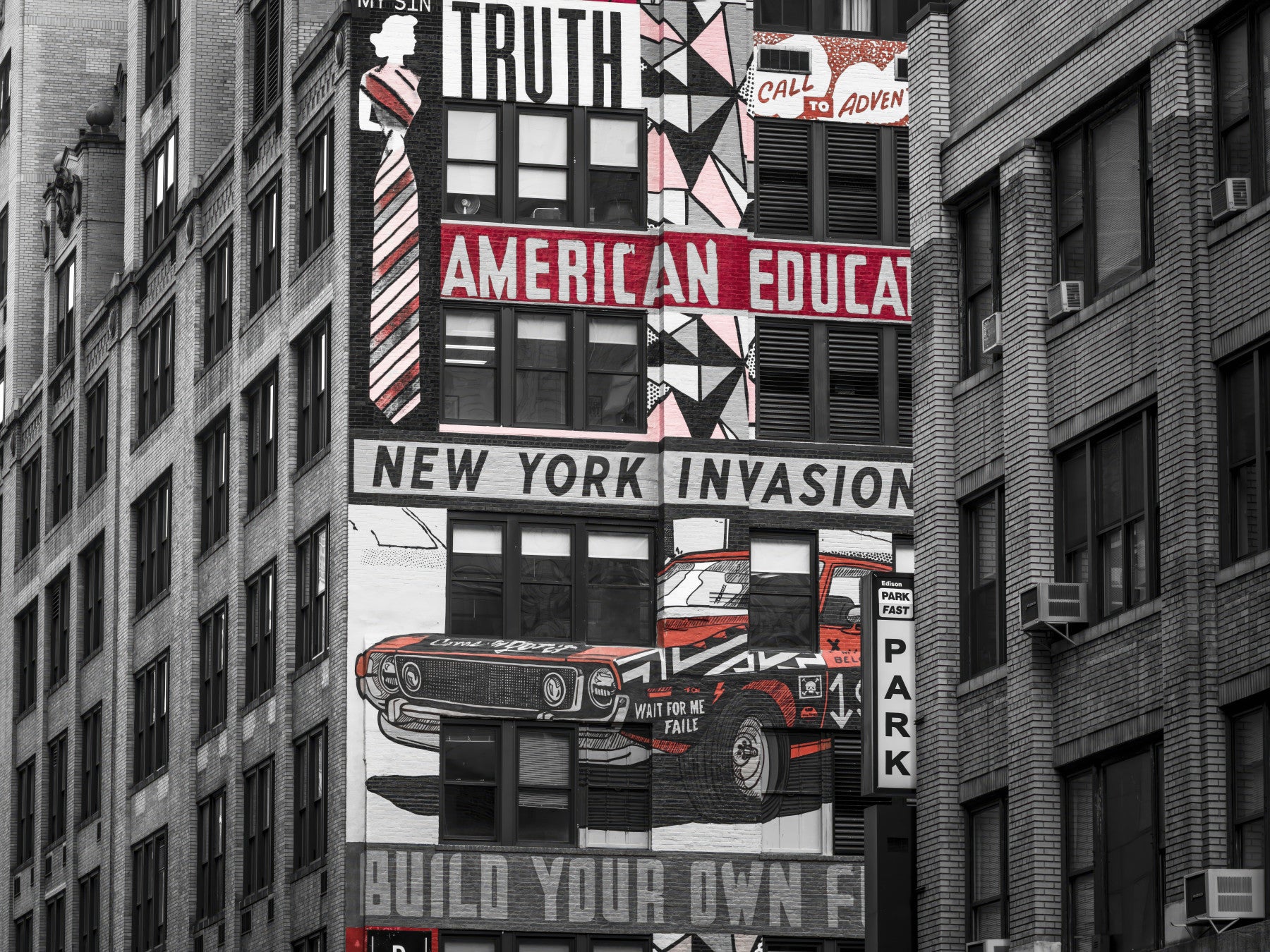 Step back in time with "Retro City Murals," a captivating wallpaper that brings the vibrant energy of vintage urban art to your digital space. This design features a striking juxtaposition of classic architectural elements and bold, graphic murals. Dominated by a grayscale cityscape, pops of crimson and white explode from the building facade, showcasing an eclectic collection of messages and imagery reminiscent of old New York. From snippets of vintage car designs and geometric patterns, to bold phrases like "American Education" and "New York Invasion", this wallpaper is a visual feast of retro typography and street art aesthetics. The high-contrast style adds a touch of grit and authenticity, perfect for those who appreciate urban history and artistic expression. "Retro City Murals" is more than just a wallpaper; it's a conversation starter, adding character and unique flair to any device.