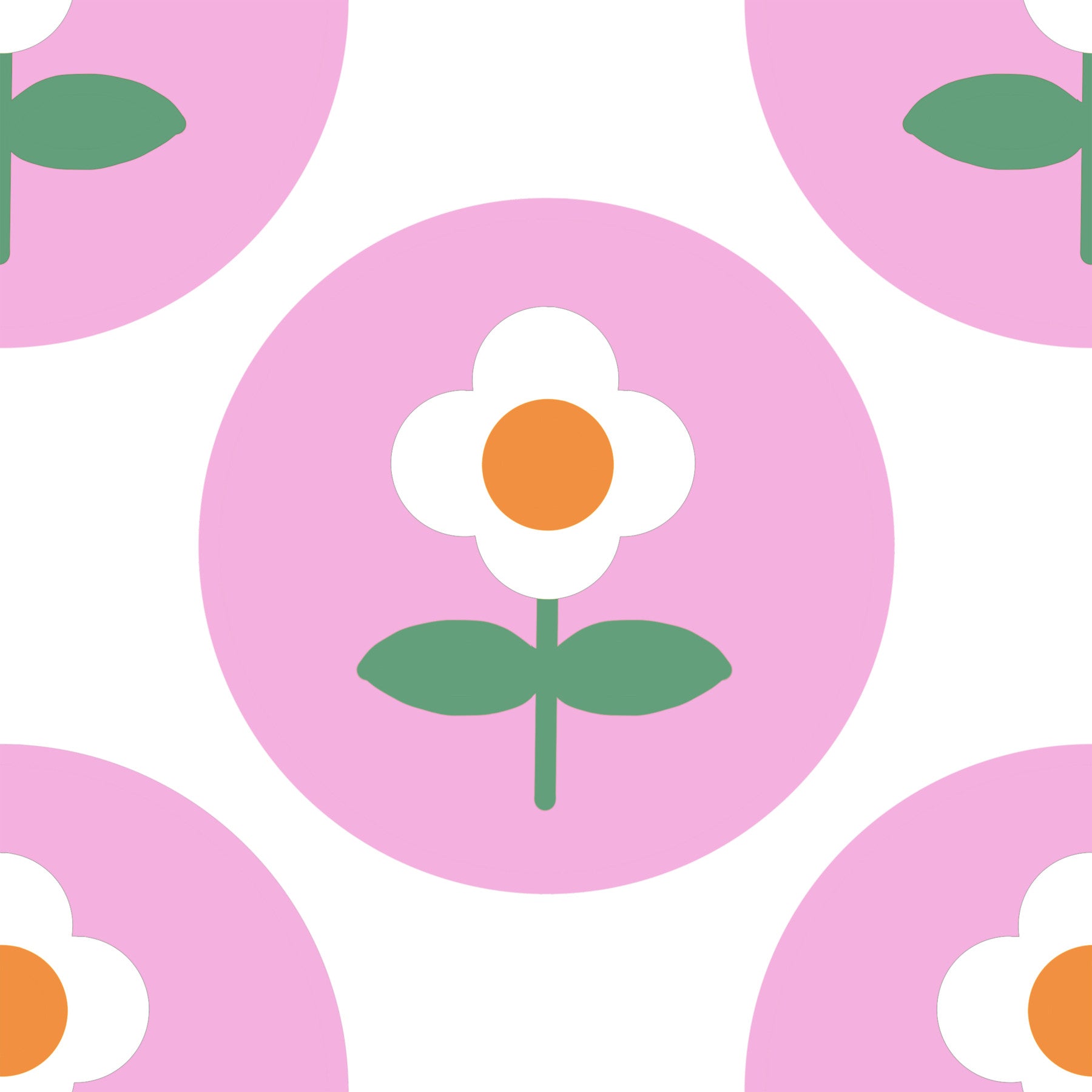 Vintage charm radiates from the Retro Daisy Circles Wallpaper, a playful arrangement where soft pink discs frame whimsical white blossoms and vibrant orange centers. This matte-finish wallpaper brings a cheerful 1970s aesthetic to any vertical surface through its bold geometric composition and nostalgic floral theme. Every daisy is centered perfectly within a circular border, creating a rhythmic and organized repeat that feels both structured and energetic. The clean white background provides a sharp contrast that makes the pastel tones pop, ensuring the wall remains a bright focal point. Its simple yet effective graphics offer a balanced visual weight, making it a great choice for modern spaces seeking a touch of classic flair. Each petal is rendered with smooth lines to maintain a crisp, professional look throughout.