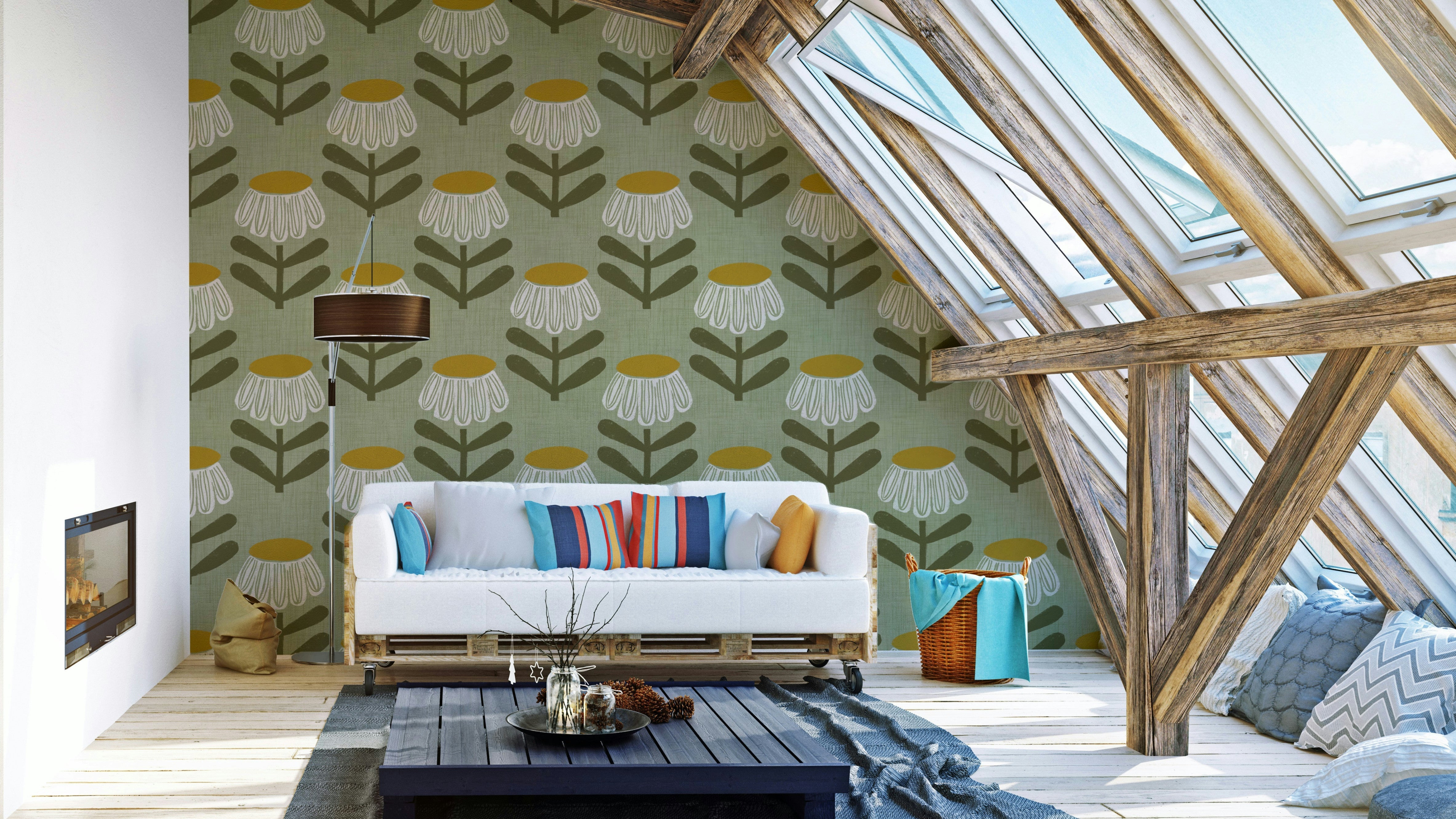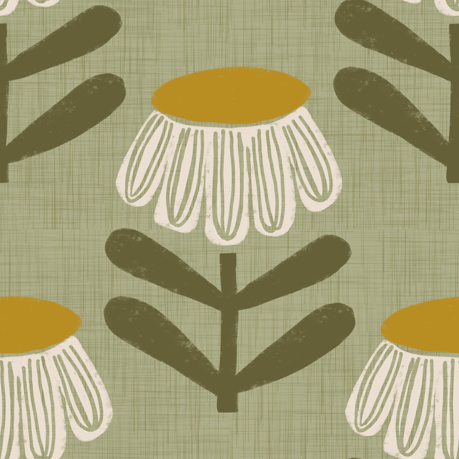 Retro Floral Sage - Mid Century Modern Daisy Wallpaper⁠