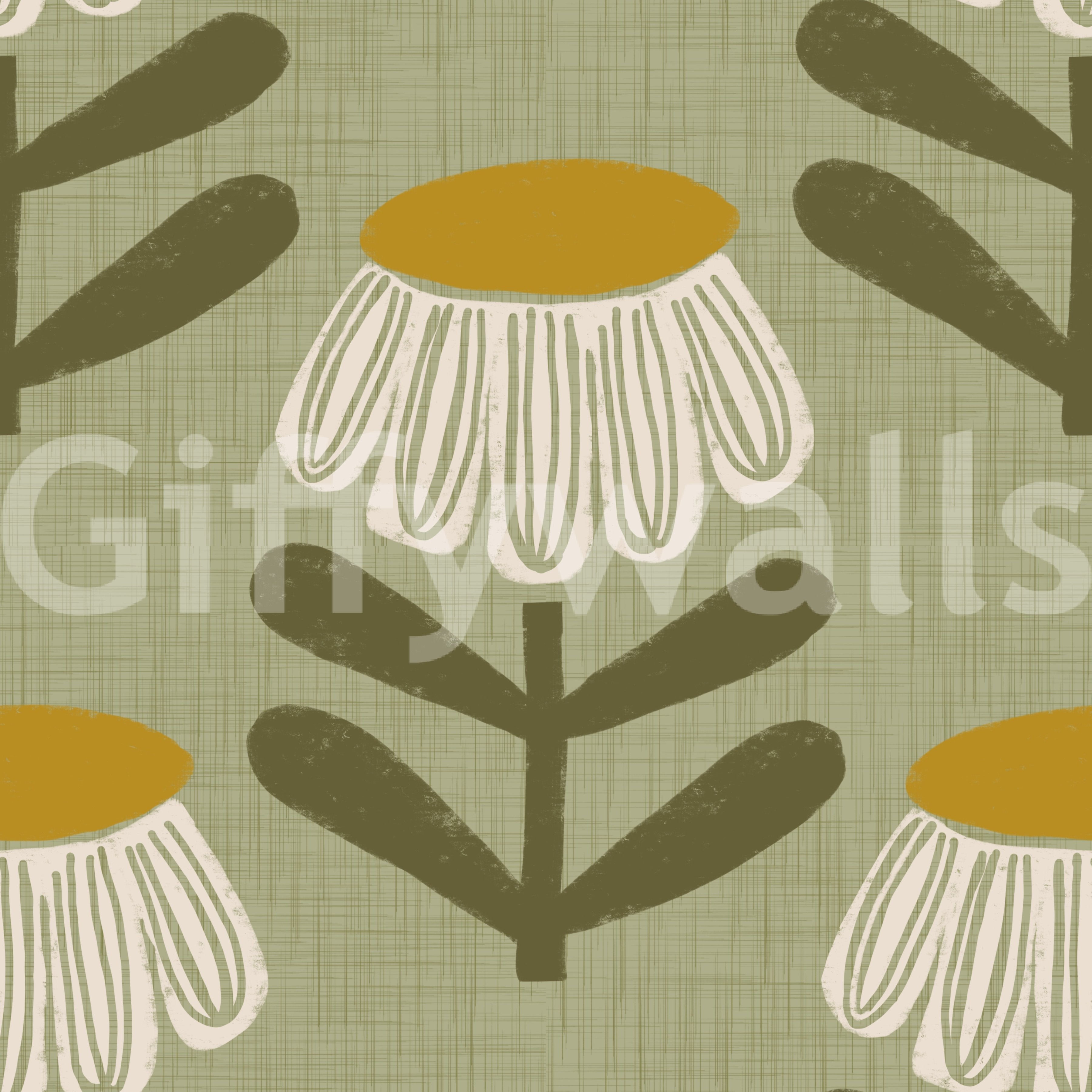 Embrace mid-century modern style with this captivating wallpaper featuring stylized daisies in a calming sage green palette. The design blends a retro aesthetic with a contemporary feel, showcasing simplified floral forms and muted earth tones. The off-white daisy petals contrast beautifully against the mustard yellow centers, creating a visually appealing texture. The subtle linen-like background adds depth and a touch of organic warmth, perfect for creating a serene and sophisticated atmosphere in any room. This wallpaper is an elegant blend of vintage charm and modern minimalism.
