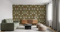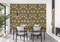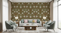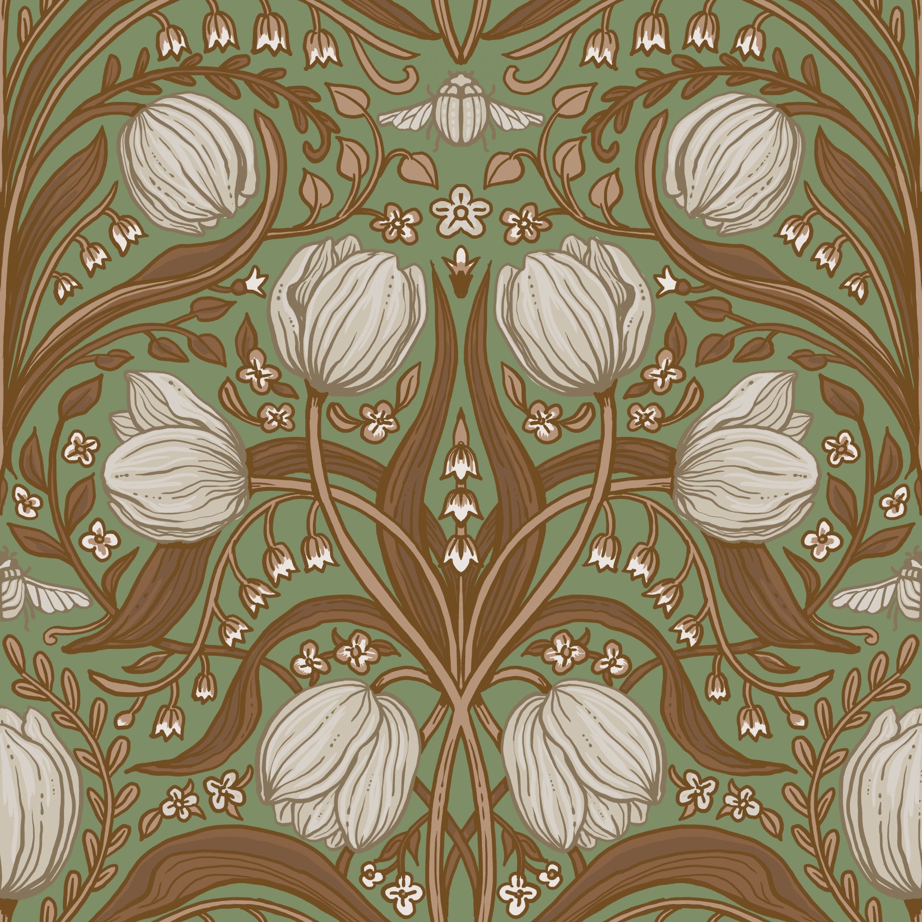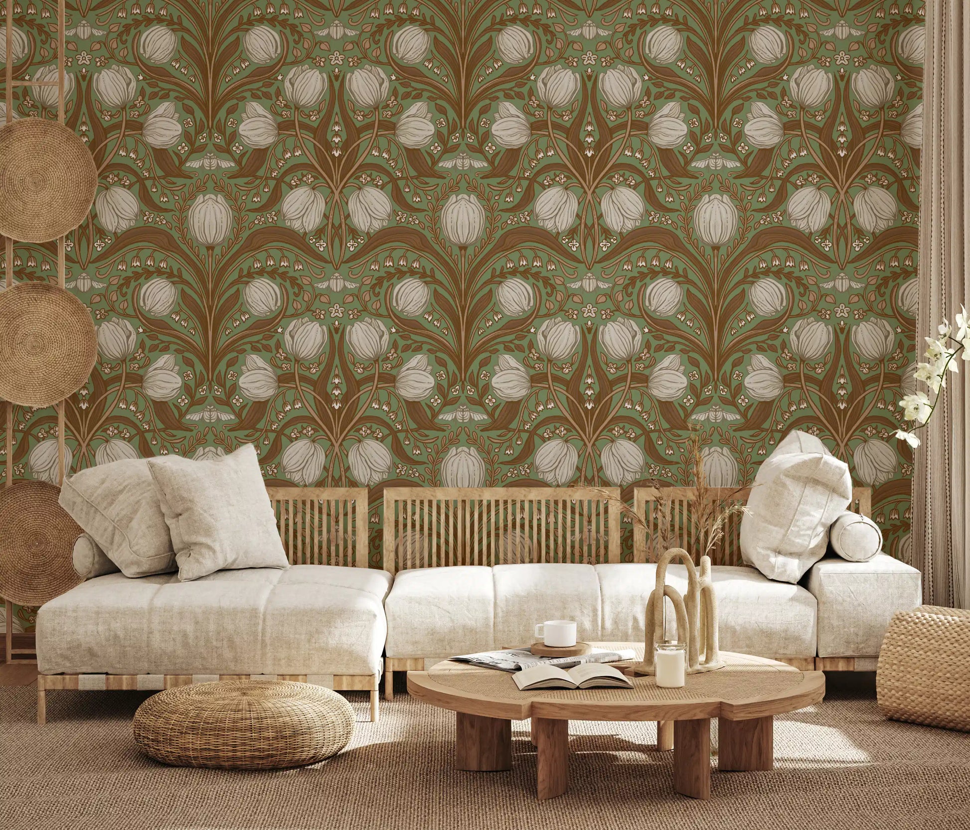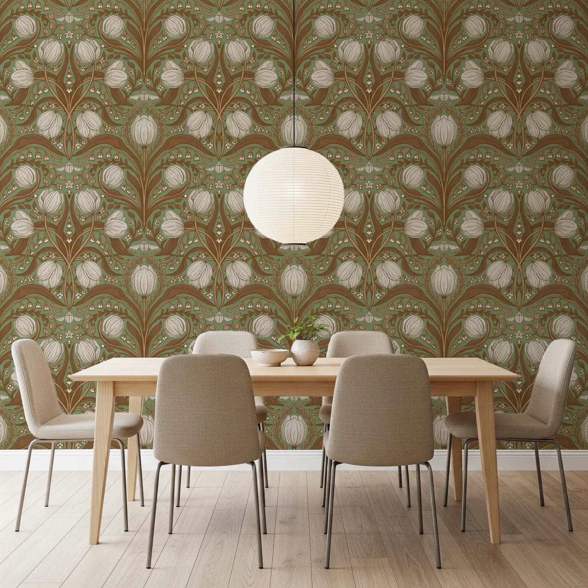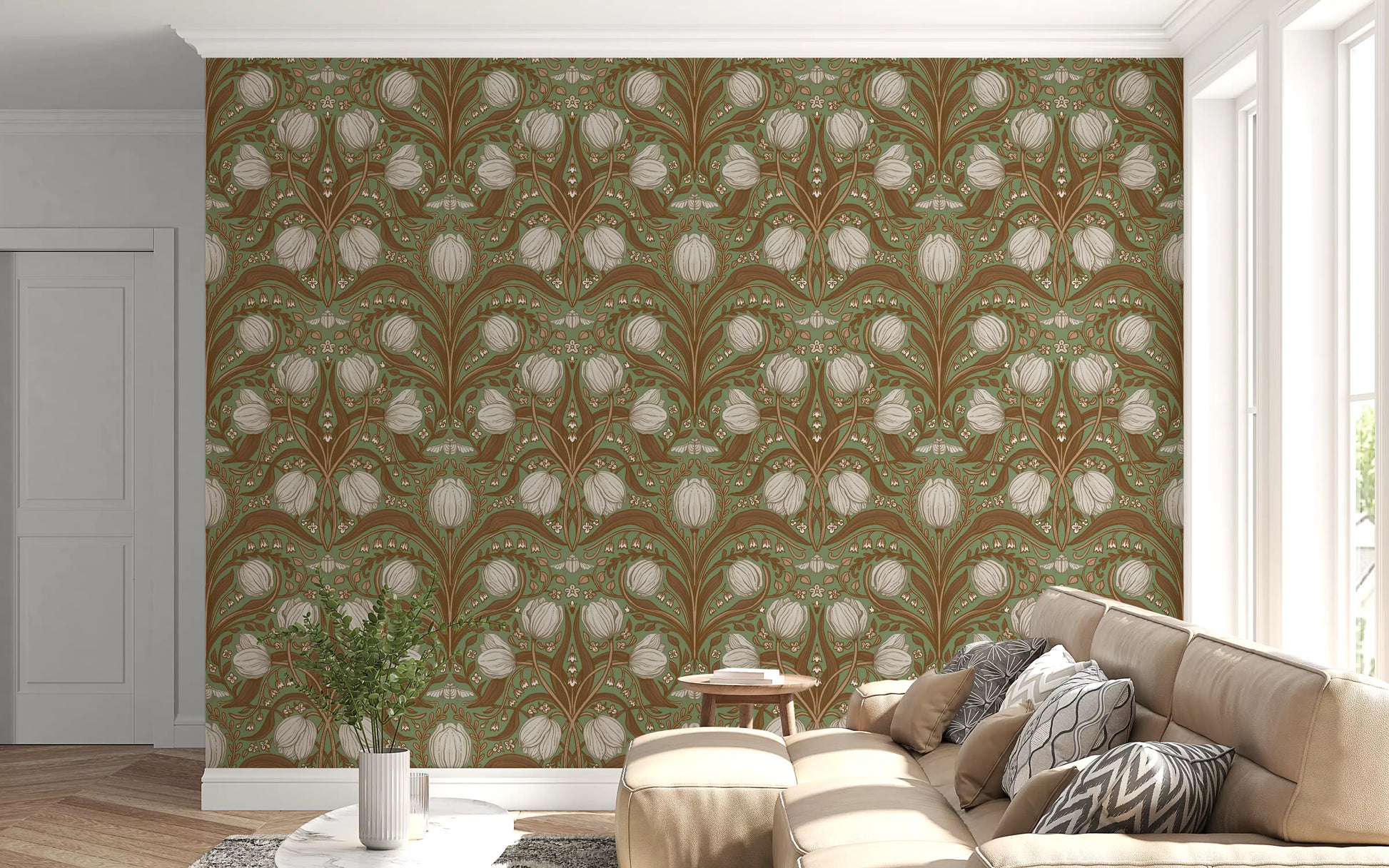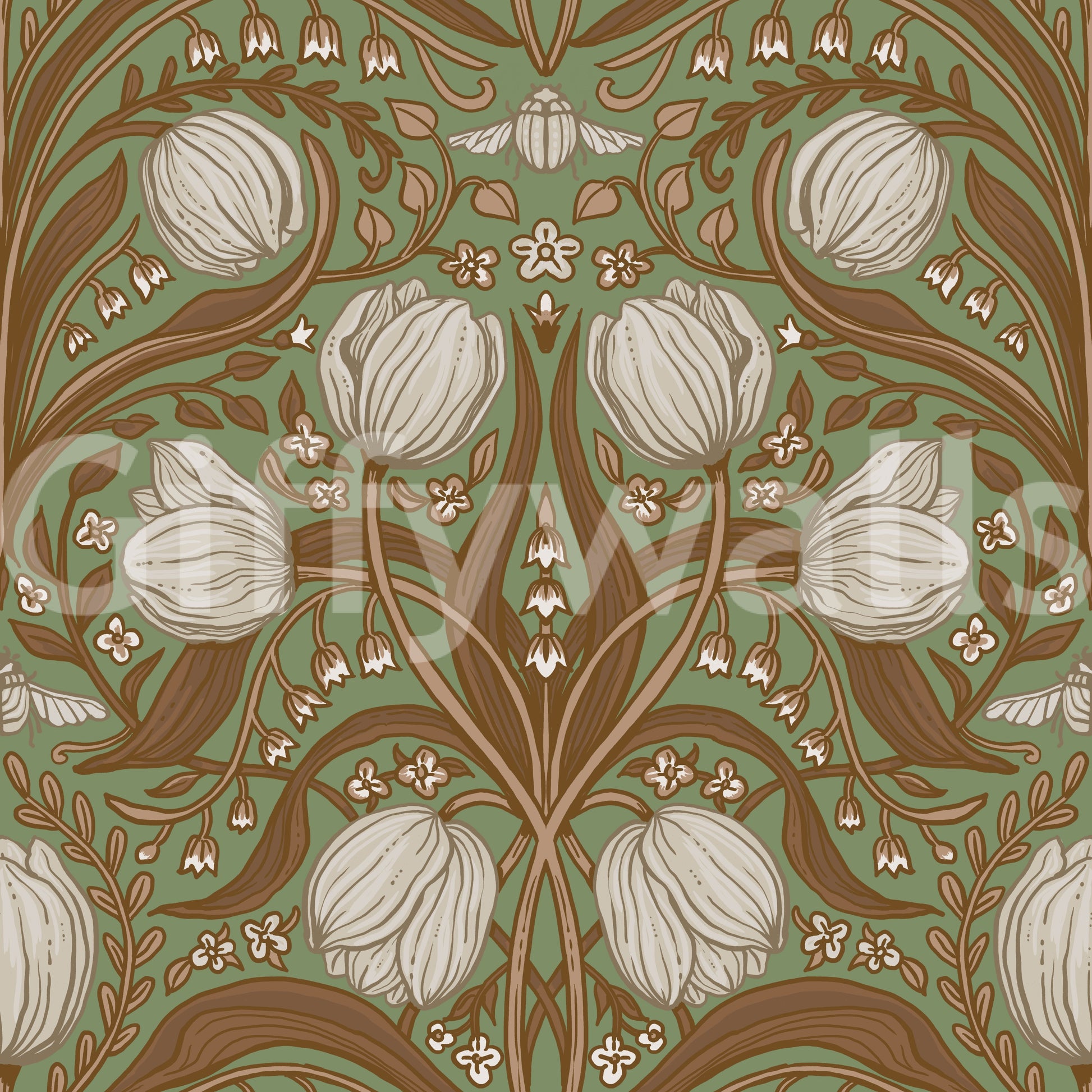 Retro Nouveau Tulips in sage and brown Wallpaper⁠