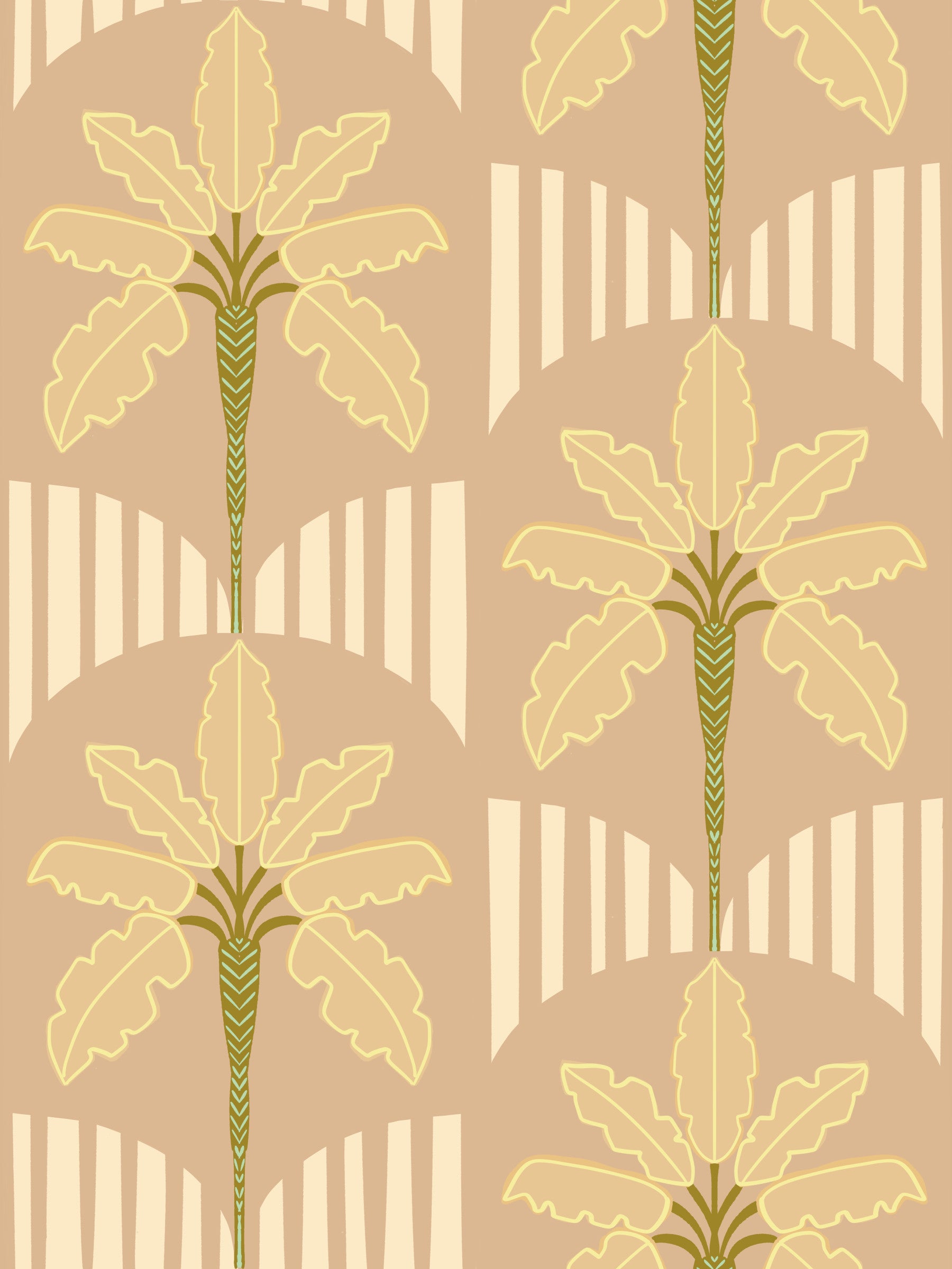 This unique wallpaper for walls brings a serene, retro-inspired botanical charm to any interior. The design showcases stylized banana palms, rendered in soft, flowing lines with elegant chevron detailing on their slender stems. A muted color palette features a warm peachy-beige background, complemented by creamy yellow leaves outlined in a subtle gold, and rich olive green accents. Arched, striped elements create a subtle geometric contrast, adding depth to the pattern. This versatile wallpaper enhances living rooms, bedrooms, or dining areas, creating an inviting and tranquil atmosphere. It also works beautifully in a nursery or home office, infusing spaces with natural warmth and an understated tropical vibe.