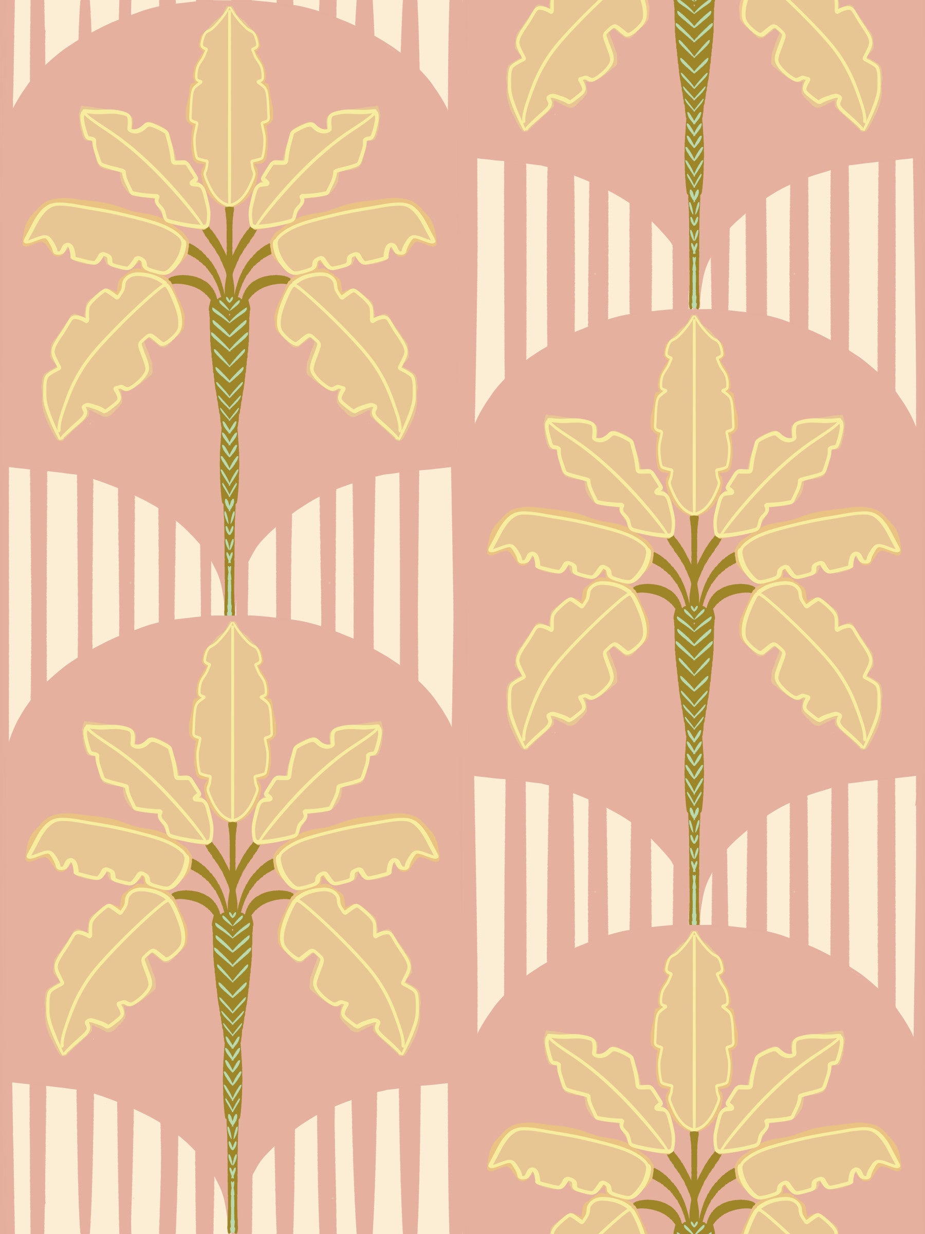 Transform your living space with this captivating wallpaper for walls, featuring a playful retro-tropical design. Stylized palm-like plants, in soft peach with sunny yellow outlines, gracefully alternate with a backdrop of cream-colored stripes and gentle pink semi-circles. The artful arrangement and olive-green accents on the plant stems create a dynamic yet serene aesthetic. This wallpaper’s Mid-Century Modern flair and warm pastel palette bring a cheerful elegance to any room. It works beautifully in living rooms, bedrooms, nurseries, or dining areas, infusing spaces with a vibrant yet calming atmosphere that invites relaxation and style. Adorn your walls with this unique botanical pattern.