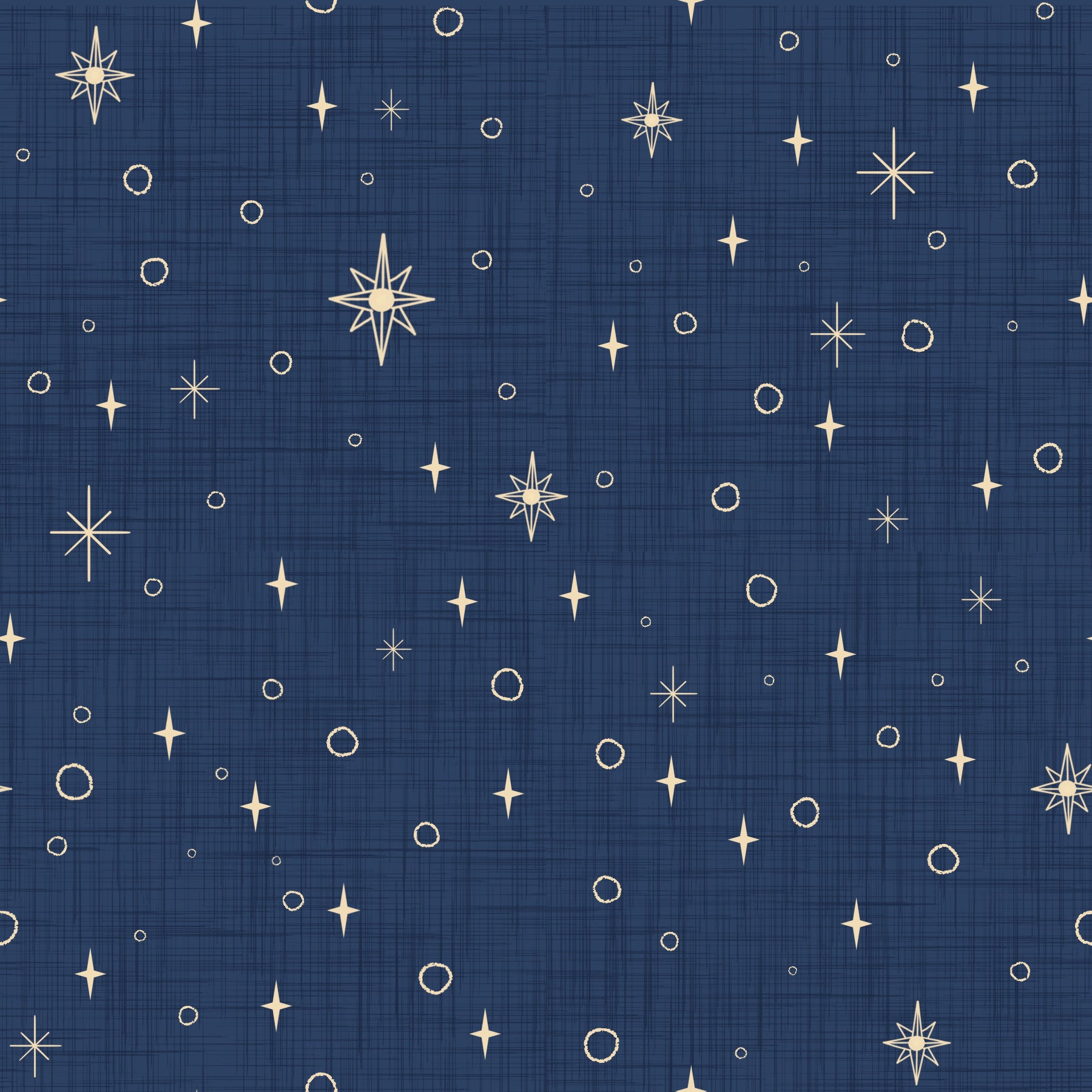 Embark on a celestial journey with this retro-inspired wallpaper, reminiscent of vintage nautical charts under a starlit sky. The deep blue backdrop, textured with a subtle linen-like weave, evokes the vast ocean depths. Scattered across this midnight canvas are stylized stars in warm, burnt amber hues, from simple crosses to intricate multi-pointed designs. Tiny, minimalist circles punctuate the design, creating a whimsical, retro feel. This pattern offers a calming and sophisticated aesthetic, perfect for creating a unique and inviting space, blending classic nautical charm with a touch of mid-century modern flair.