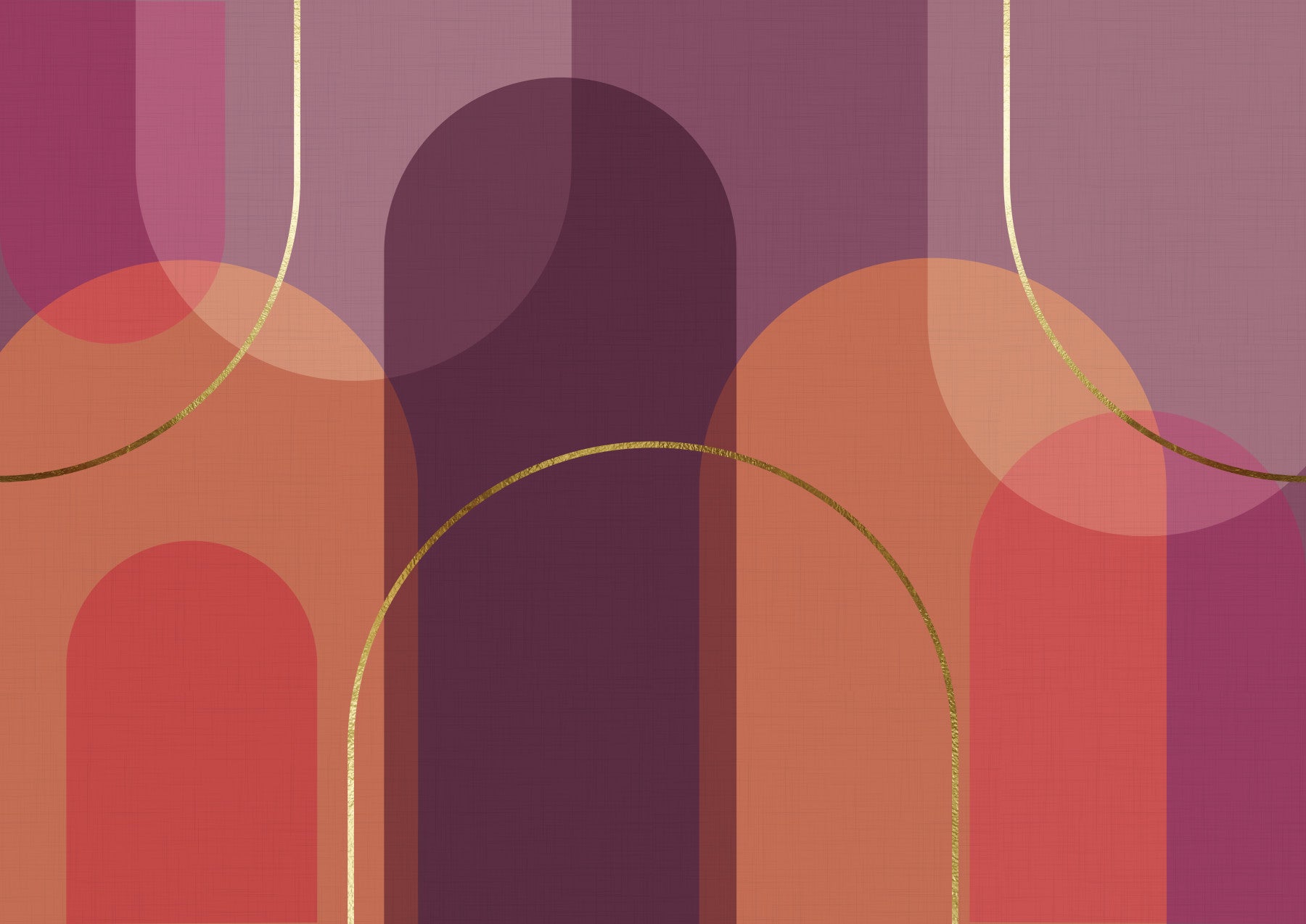 Introduce a touch of modern elegance with this geometric design. The playful combination of circles, arches and vertical forms in earthy tones, complemented by delicate gold lines creates a sophisticated look. This wallpaper enhances living rooms, bedrooms, or dining rooms with its warm color palette. It introduces a serene, luxurious feel while easily pairing with contemporary furniture and decor.