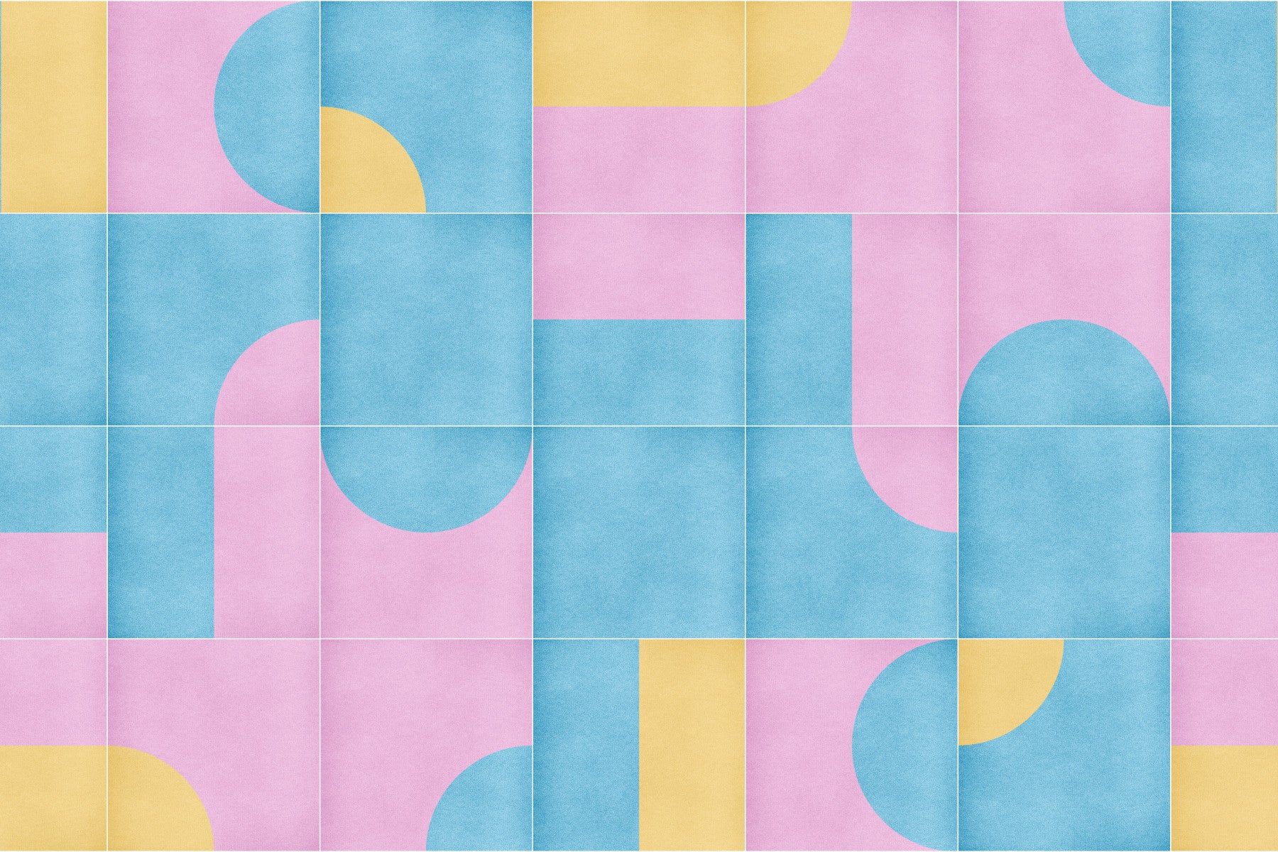 Step back into a world of playful geometry and pastel dreams with Retro Tiles 11. This wallpaper captures the essence of mid-century modern design, featuring a dynamic arrangement of squares adorned with semi-circles. A palette of soft pinks, calming blues, and gentle yellows creates a visually soothing yet engaging backdrop. Each tile appears to have a subtle fabric-like texture, adding a tactile depth to the retro aesthetic. "Retro Tiles 11" is the perfect choice for adding a touch of vintage charm and artistic flair to any space. Its balanced composition and cheerful colors make it suitable for bedrooms, living areas, or even a creative workspace, inspiring a sense of nostalgia and a touch of whimsy. This design is a nod to the past with a fresh, modern sensibility.
