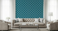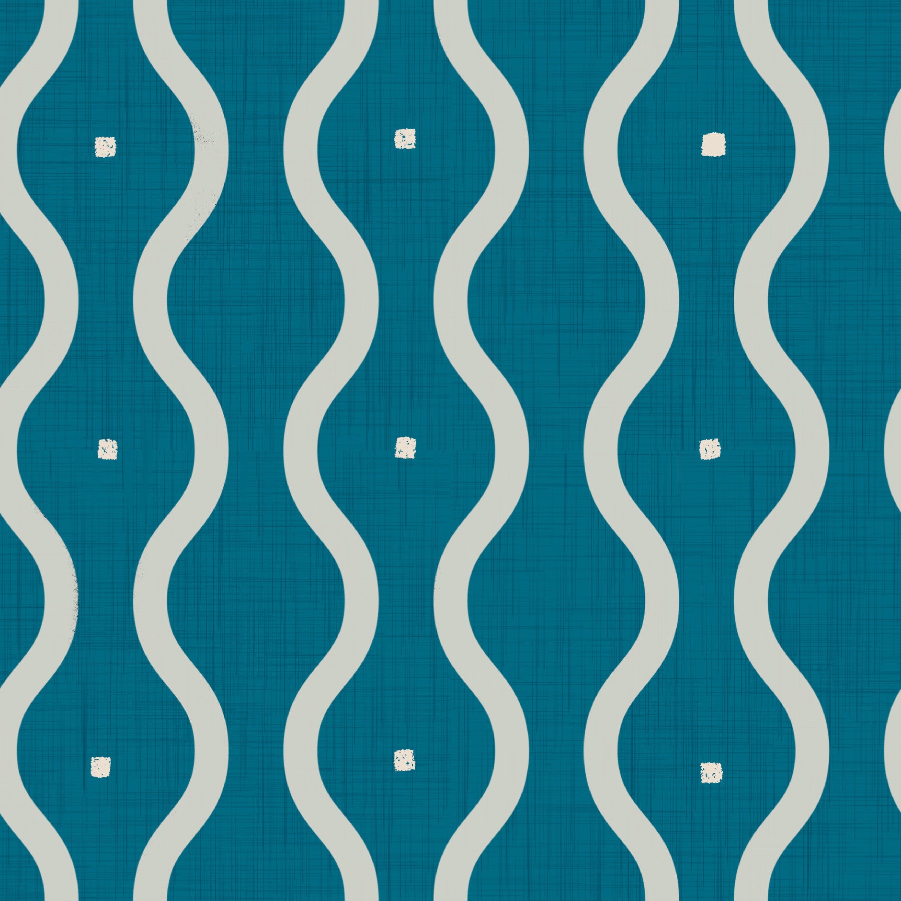 Dive into a wave of retro charm with this engaging wallpaper for walls. The design features flowing, off-white lines that create a dynamic, undulating pattern against a vibrant teal background. Small, textured squares add subtle visual interest, giving a nod to mid-century textile design. Ideal for a living room, bedroom, or hallway, this pattern brings a touch of sophistication and movement. It pairs beautifully with both modern and vintage decor, adding personality to interiors.