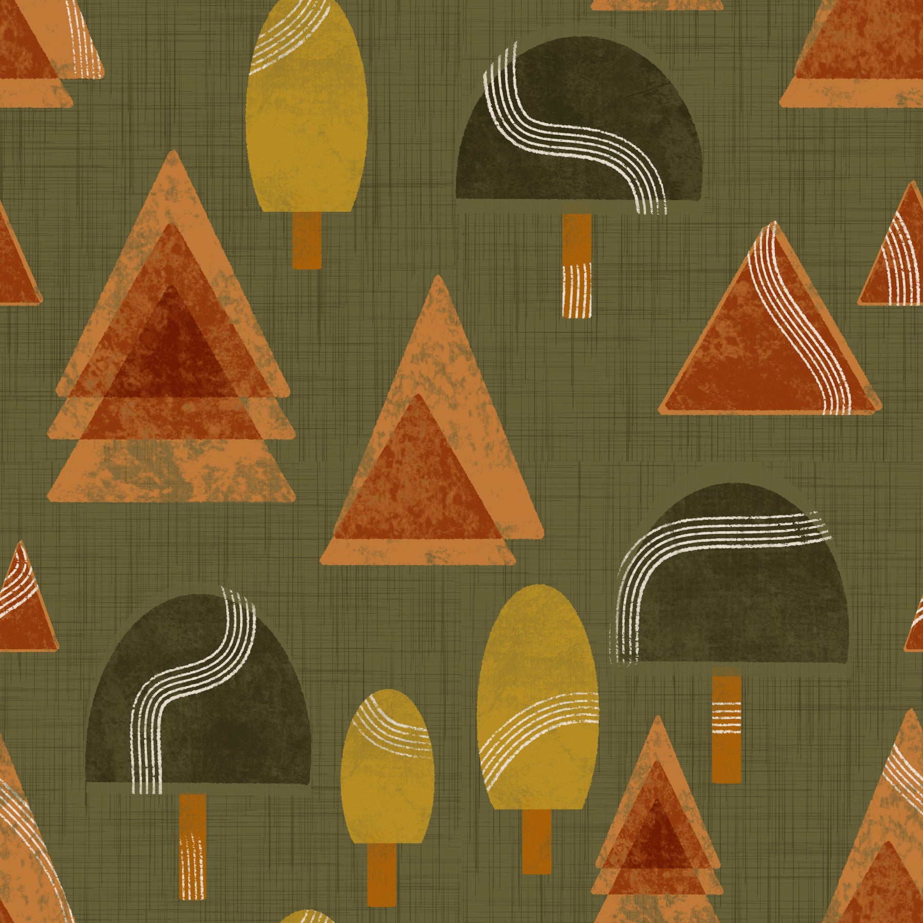 Step back in time with our 'Retro Woodland Tapestry' wallpaper. This design reimagines a classic mid-century aesthetic with a whimsical woodland twist. A harmonious blend of earthy olive greens and soft blush tones creates a comforting and stylish backdrop for any room. Featuring stylized trees in geometric shapes, including triangles and semi-circles, this design evokes a sense of nostalgia with a modern sensibility. The tapestry-like texture adds depth and warmth, making it a perfect choice for creating a cozy and inviting space. Delicate white details tracing the shapes of trees evoke the feeling of sun rays gently breaking through the foliage. Whether you're looking to create a vintage-inspired living room or a serene, nature-infused bedroom, this wallpaper offers a timeless appeal that complements a wide range of interior styles.